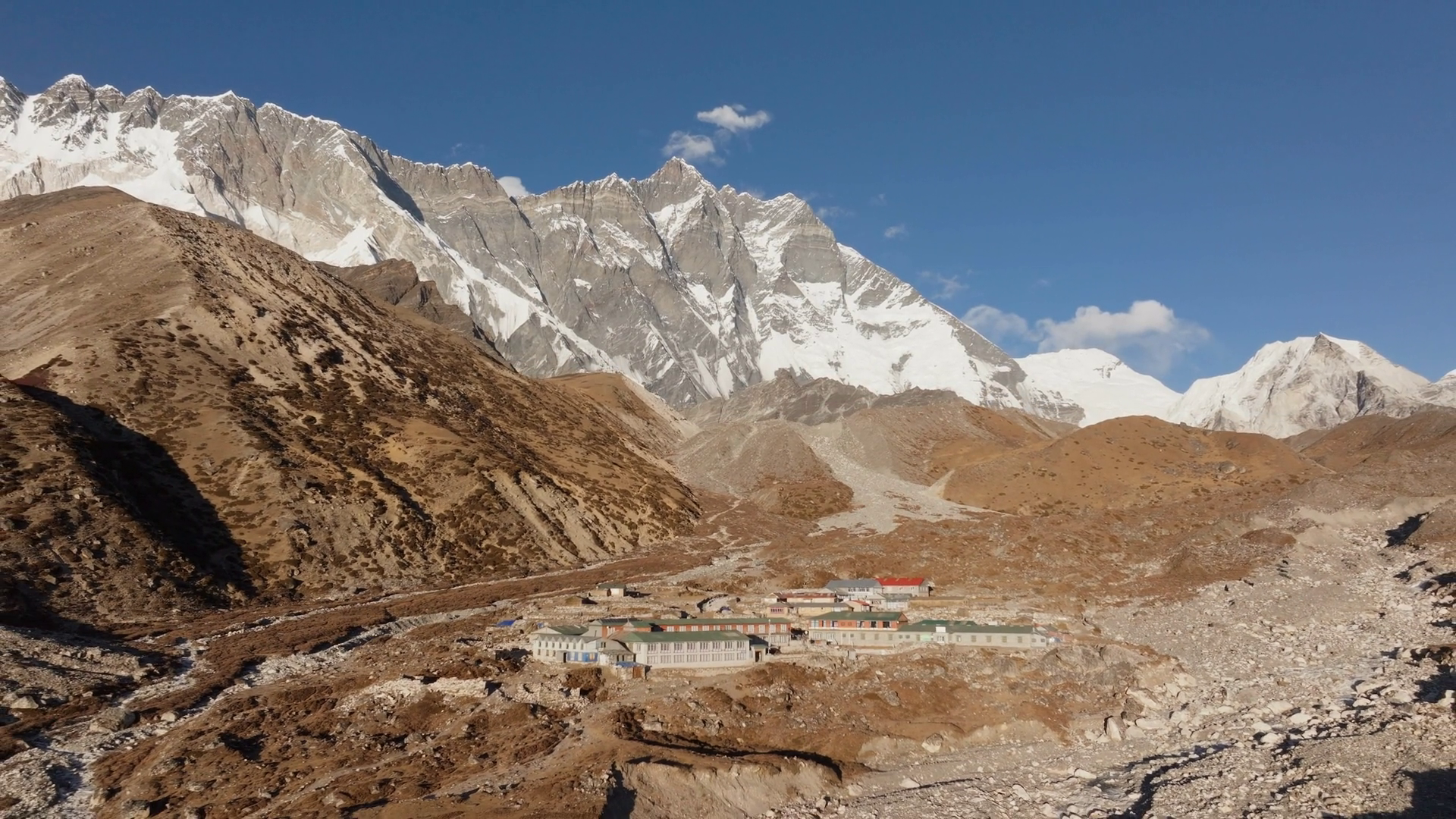 Drone View Of A Secluded Nepali Village In The Himalayas Highlighting Traditional Buildings And Grand Snowy PeaksÂ