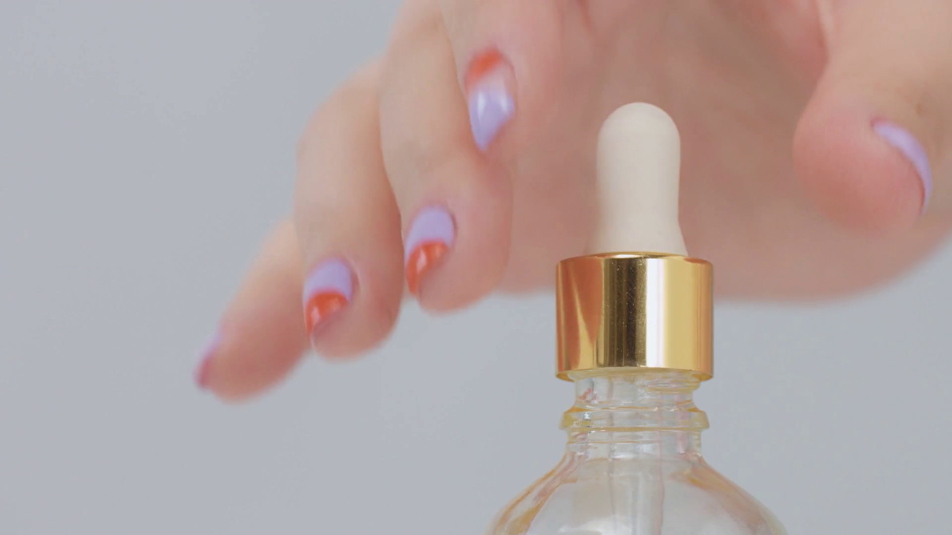 Dropper With Cosmetic Oil Womans Hand With Modern Nail Take Out Dropper And Oil Drops Falling Down Oil Cosmetic TextureÂ