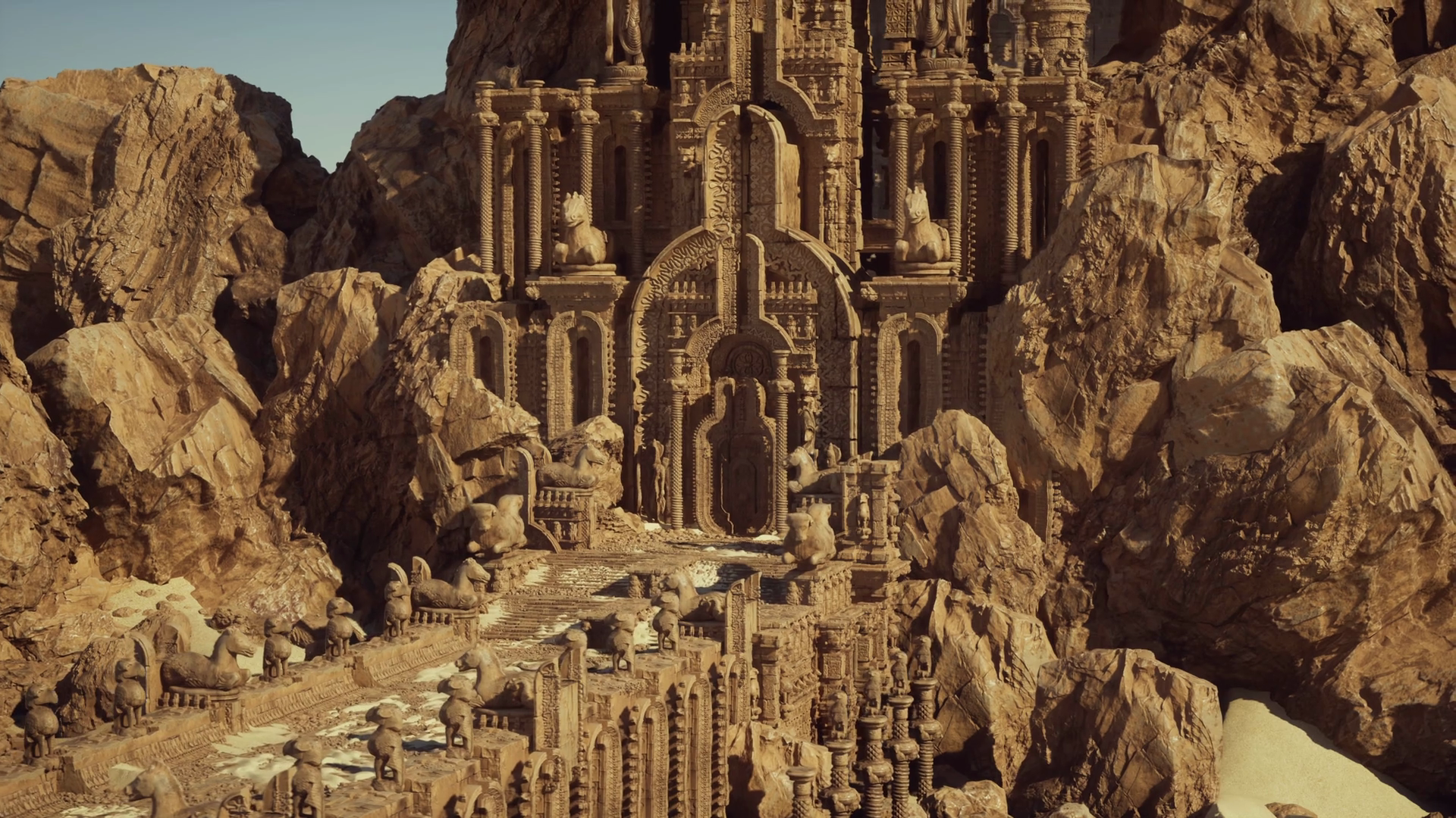 Dust Drifting Over Panoramic View Of Aged Ruins And Majestic Arches