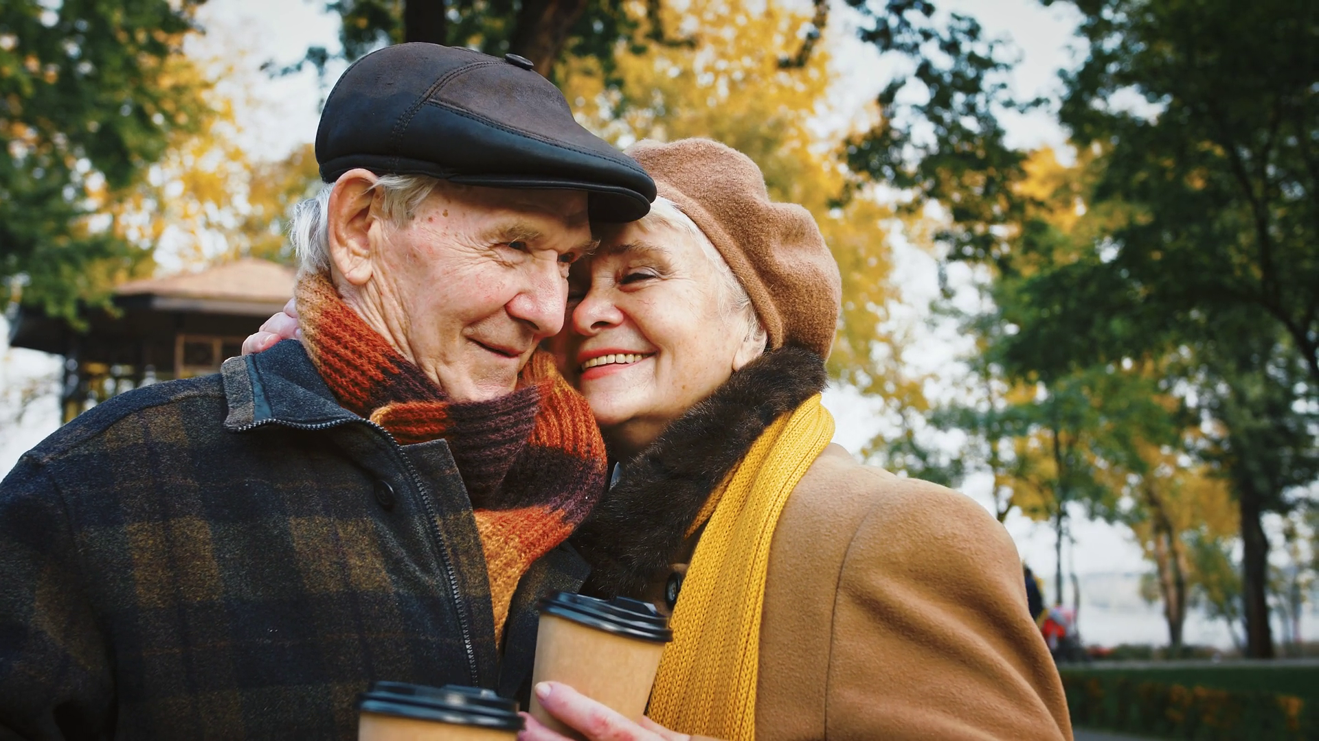 Elderly Husband And Wife Holding Paper Cups Of Coffee Smiling And Hugging Posing In Autumn Park During WalkÂ