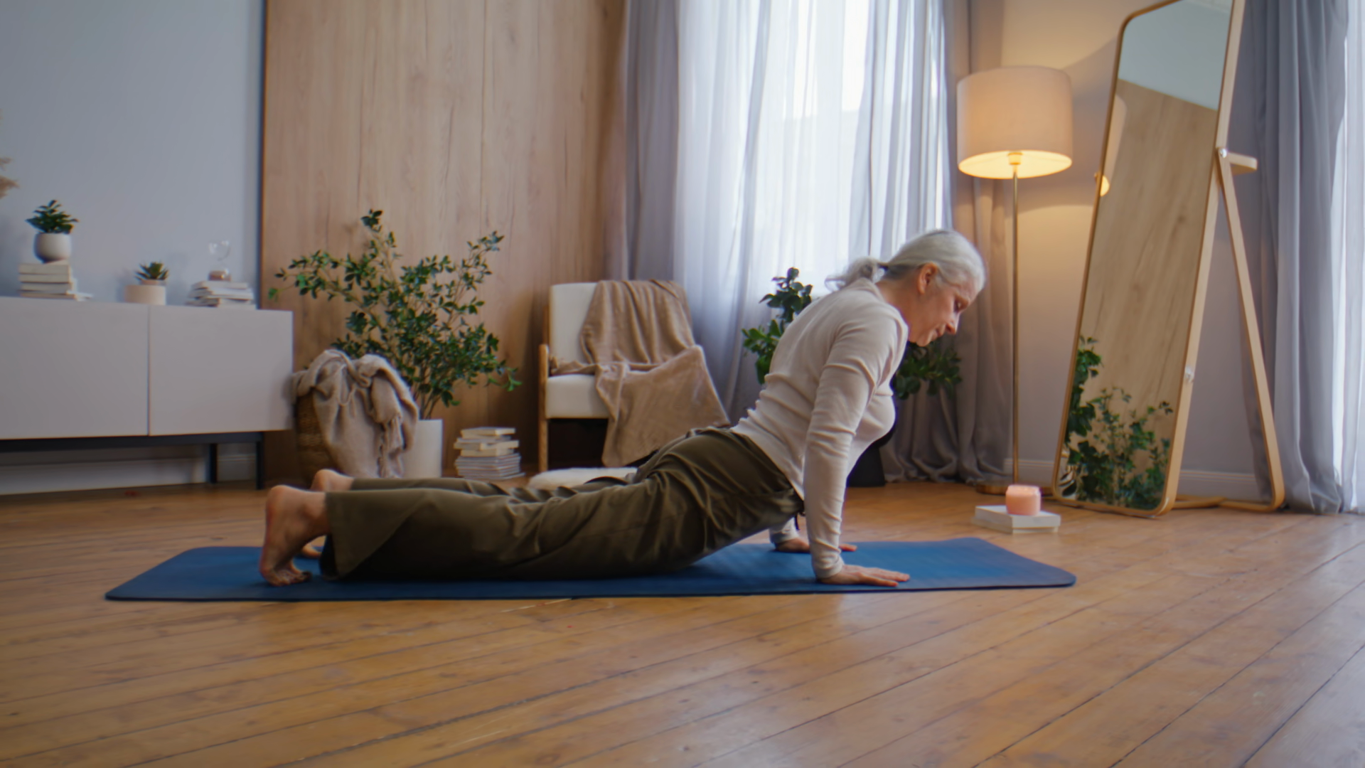 Elderly Woman Holds Cobra Pose Keeping Composed Steady BreathÂ