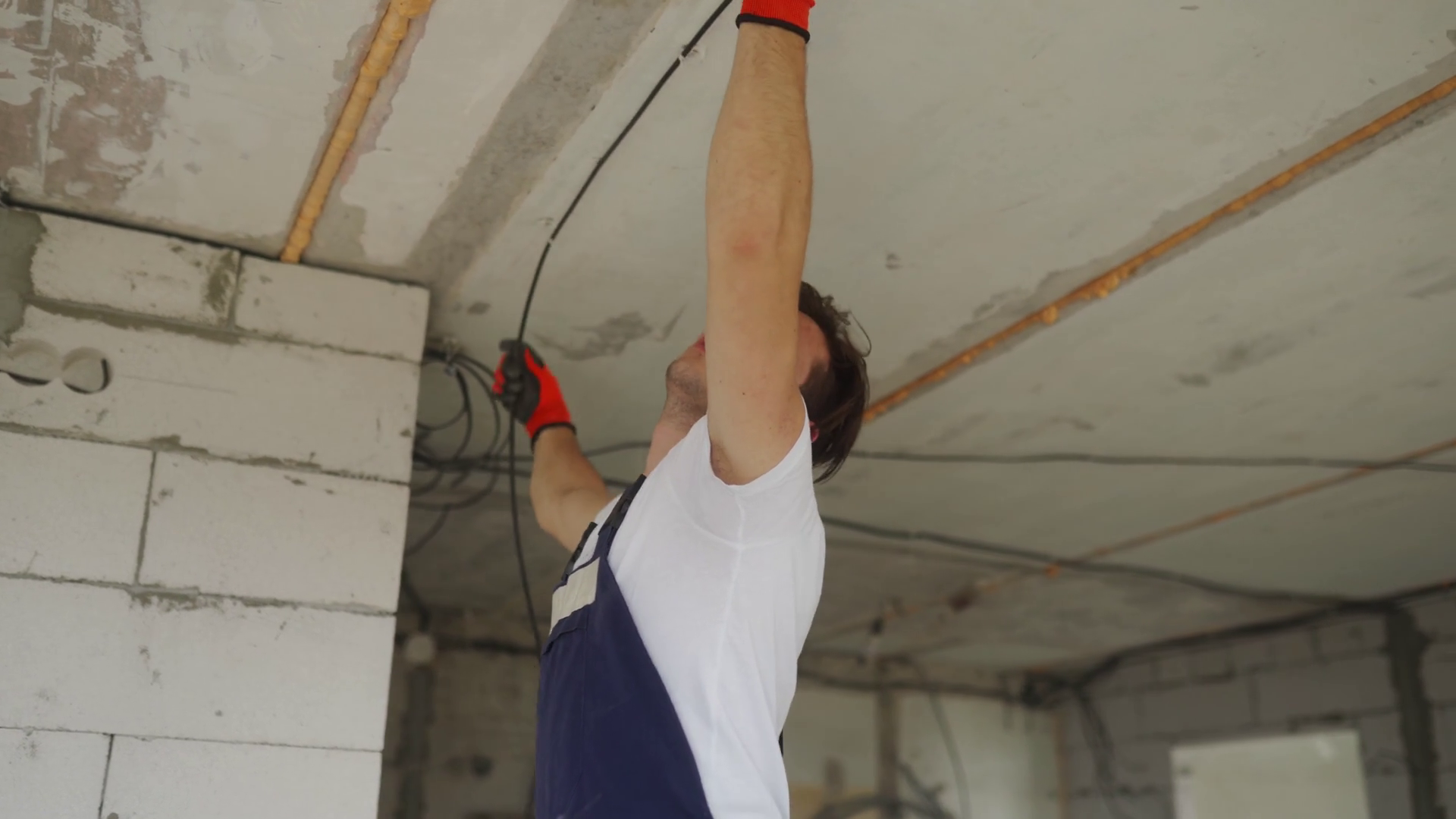 Electrician Laying Wiring Cable Mounting Electricity Lines In The House Builder In Overalls And Gloves Installs Electric Wires On Construction Site Man Doing Apartment RenovationÂ