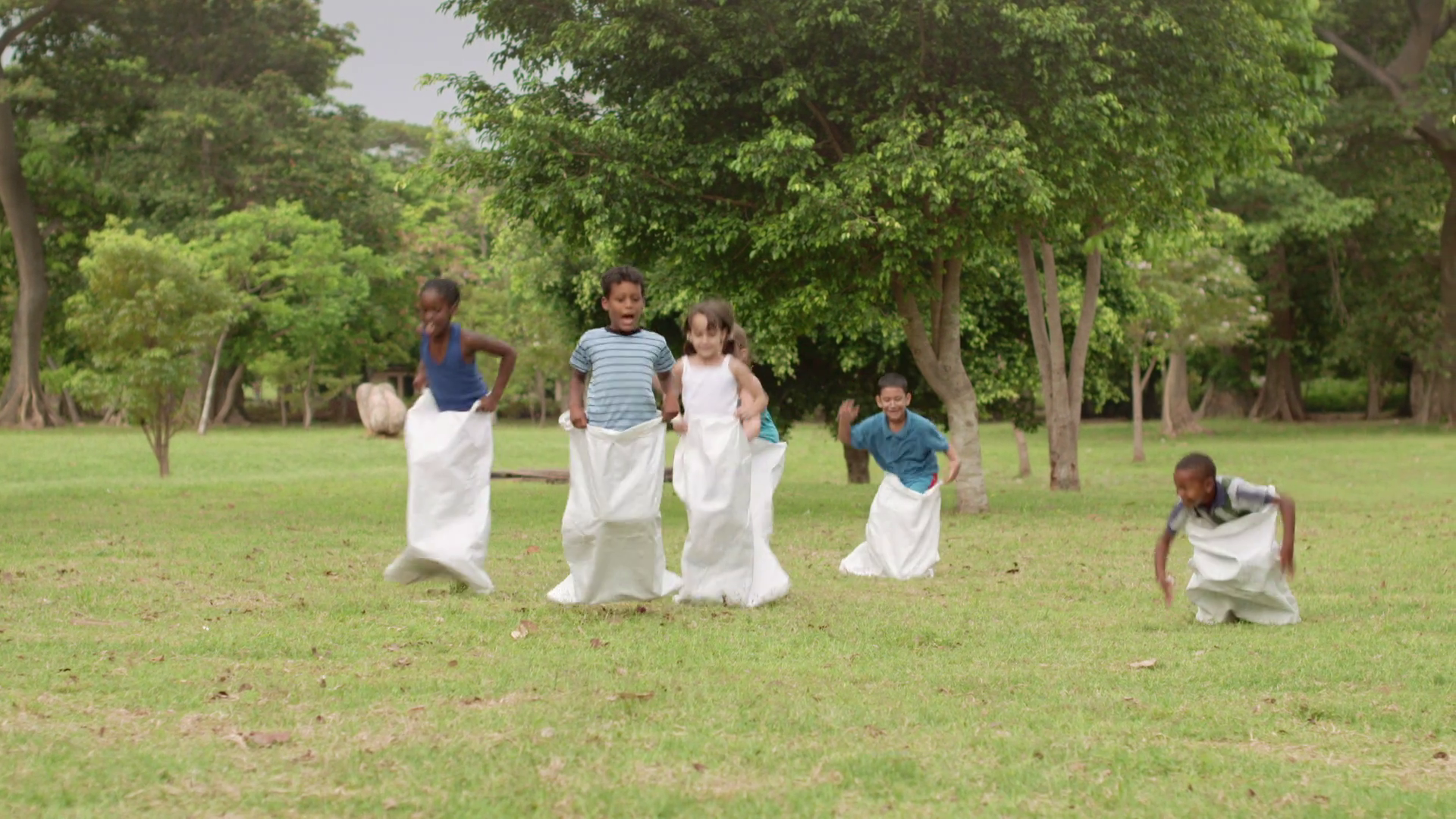 Elementary School Teacher And Kids Having Fun And Playing Sack Race In City ParkÂ