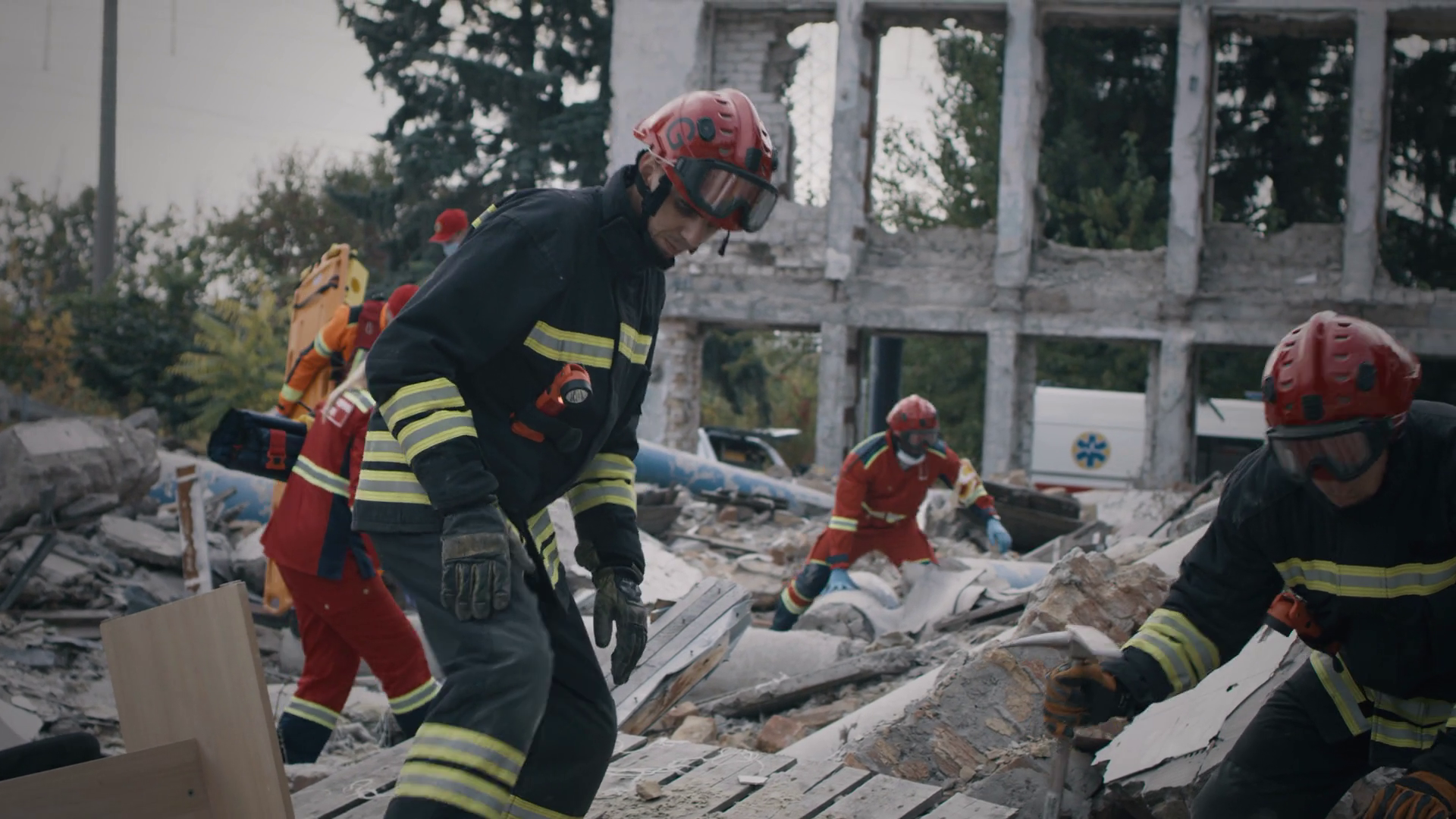 Emergency Service Workers In Uniform Walking On Remains Of Broken Building And Removing Rubble During Rescue MissionÂ