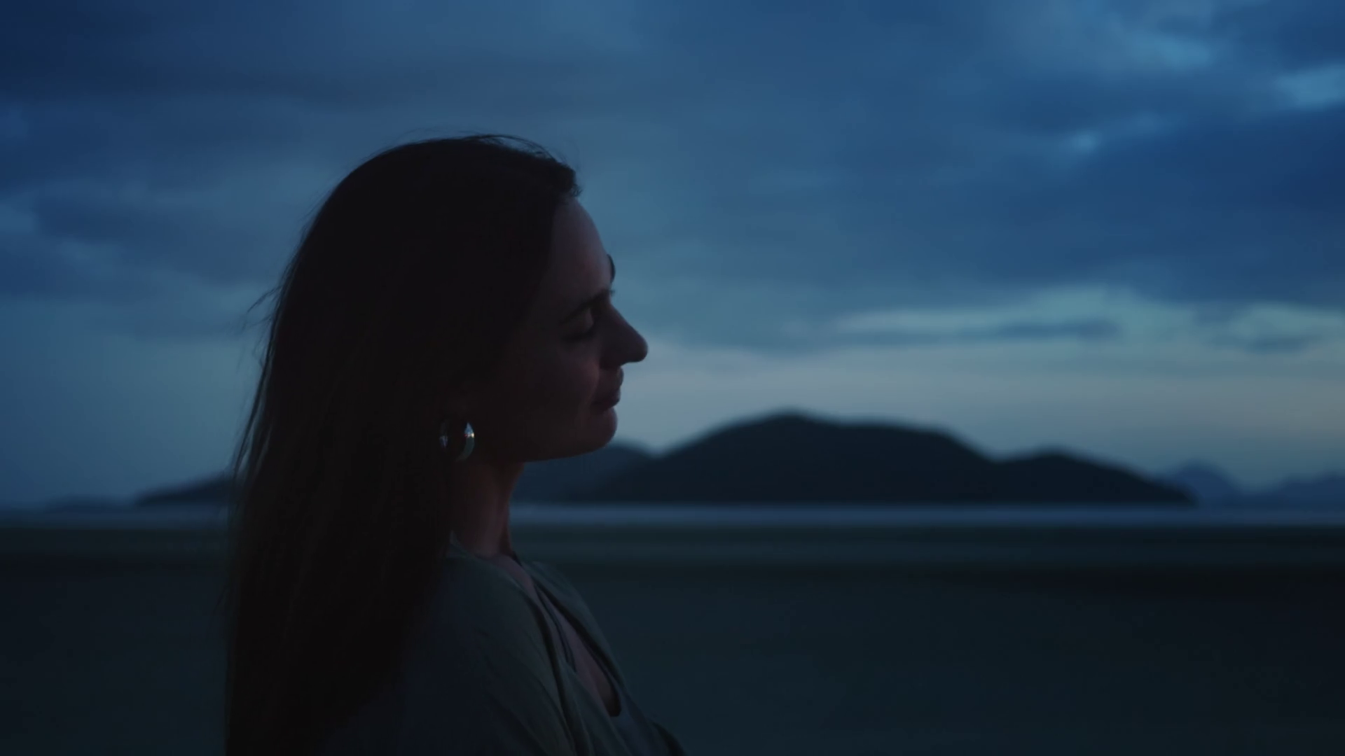 Enjoying Solitude At Sunset Woman Enjoying Breathtaking View Of Tropical Island From Balcony Of Cruise Ship At Dusk Soaking In SereneÂ