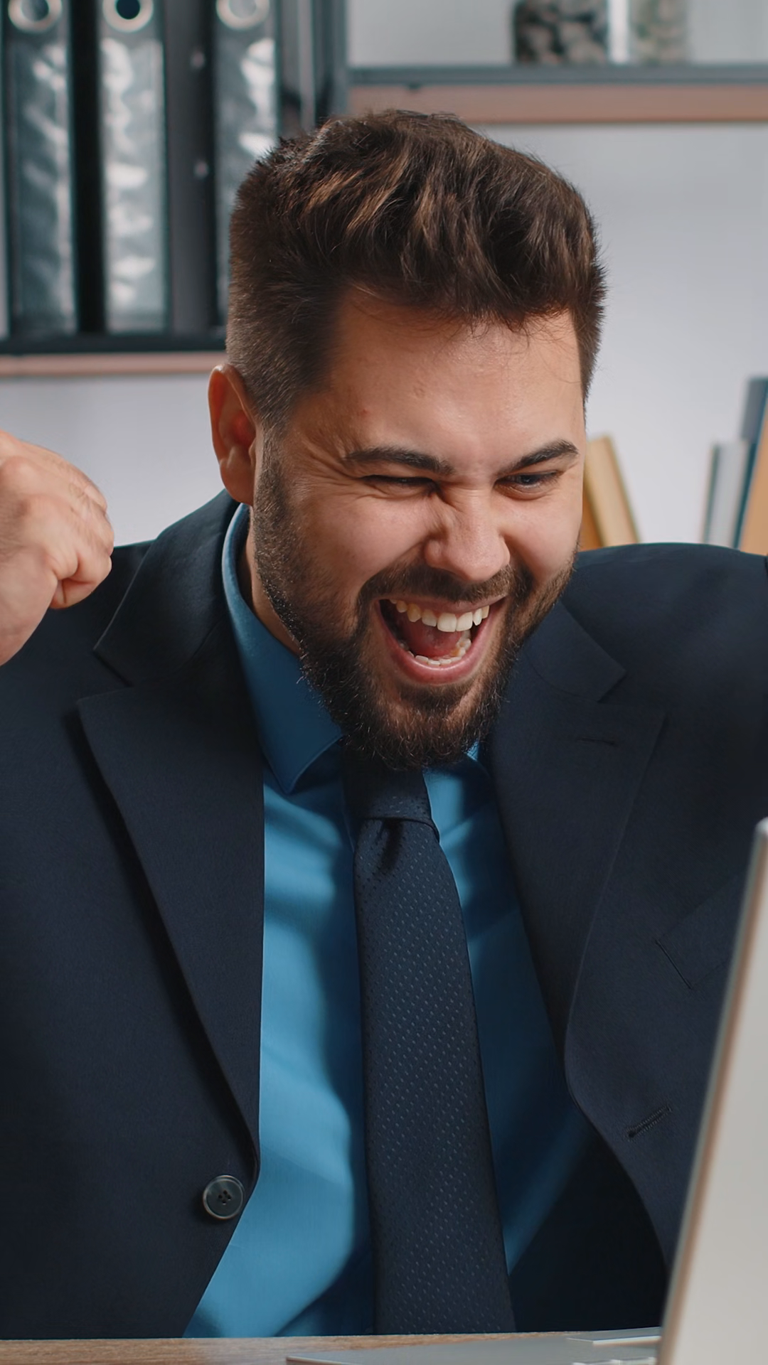 Excited Young Caucasian Businessman Reading Great News On Laptop Celebrating Success In His OfficeÂ