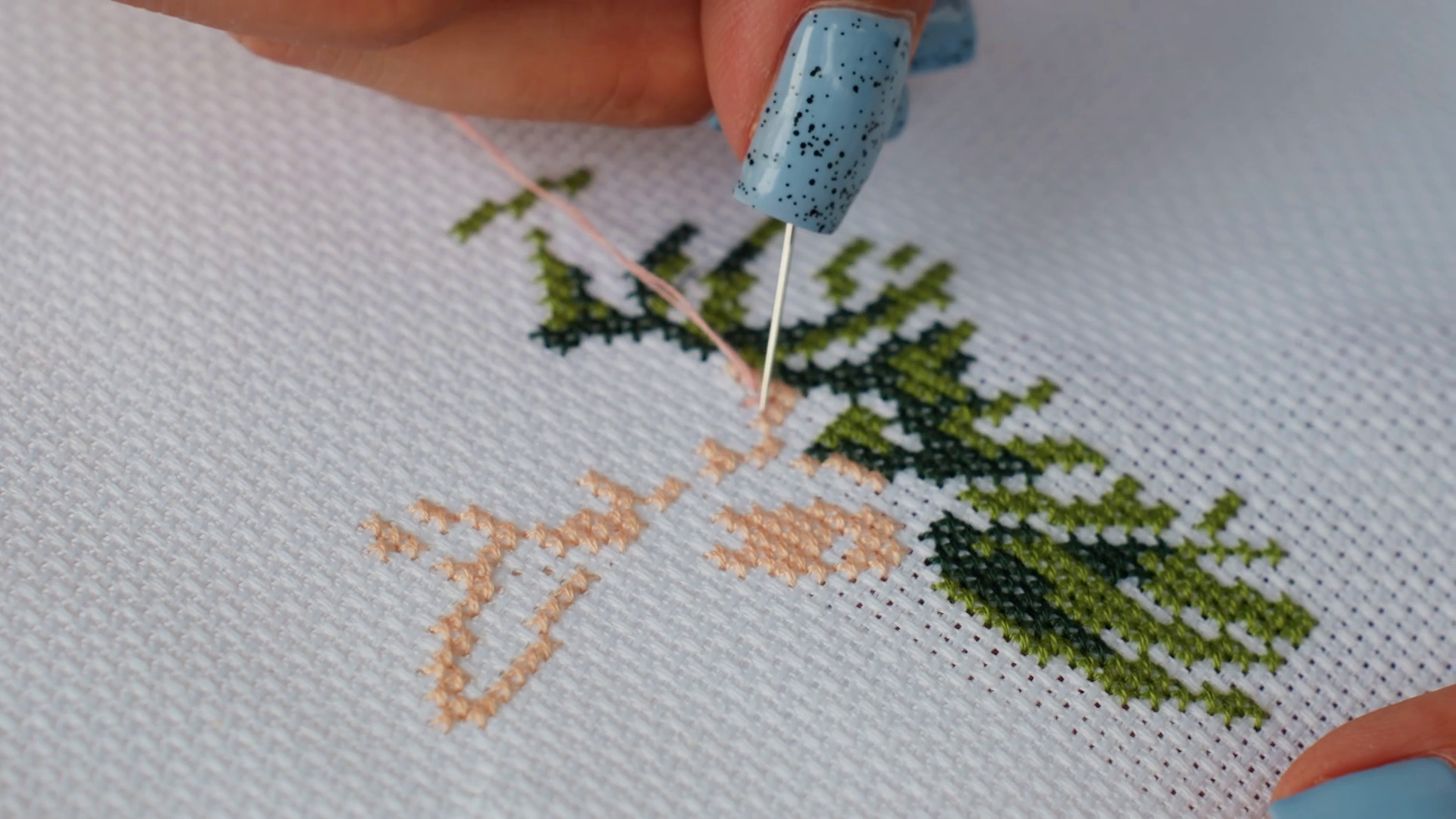 Extreme Close Up Of Craft Person Embroidering Green Tree On White Fabric Using Pink Thread And Needle Showing Delicate Handwork DetailedÂ