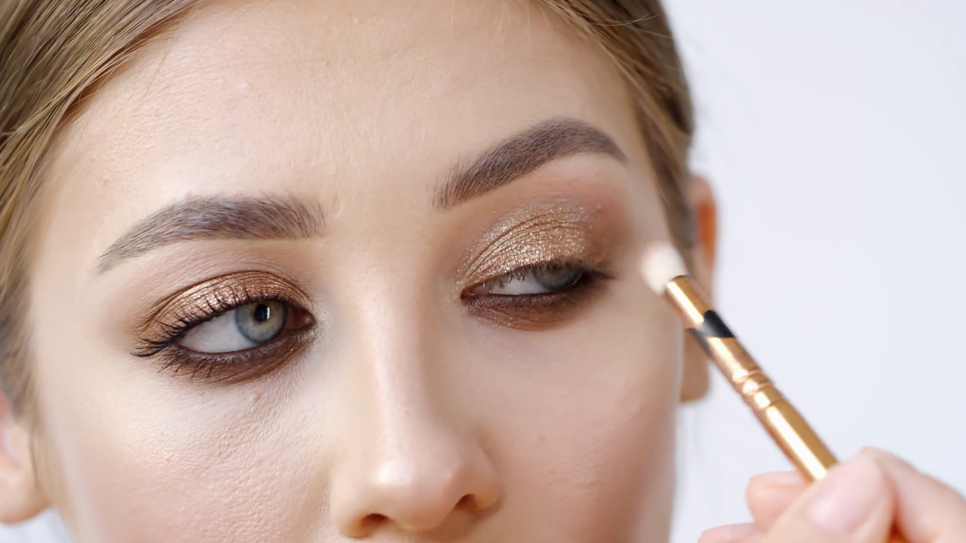 Closeup Shot Of Woman Applying Golden Eyeshadow With Makeup BrushÂ