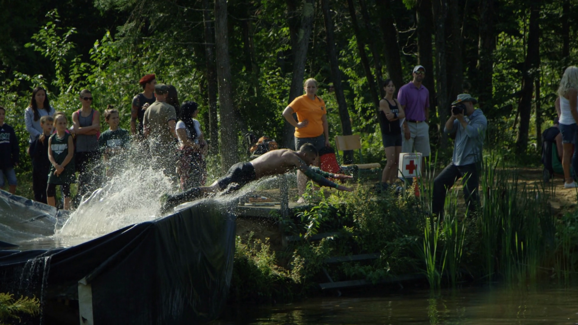 Extreme Sports Race Slow Motion Man On Water Slide Jump Into Lake Obstacle Race