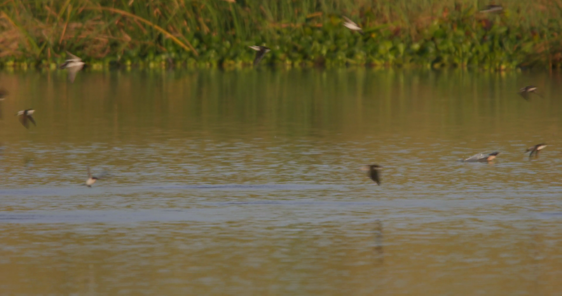 Extreme Wide Shot Of Barn Swallows Hirundo Rustica Diving Down Water For A Quick Rinse During Sunrise In KenyaÂ
