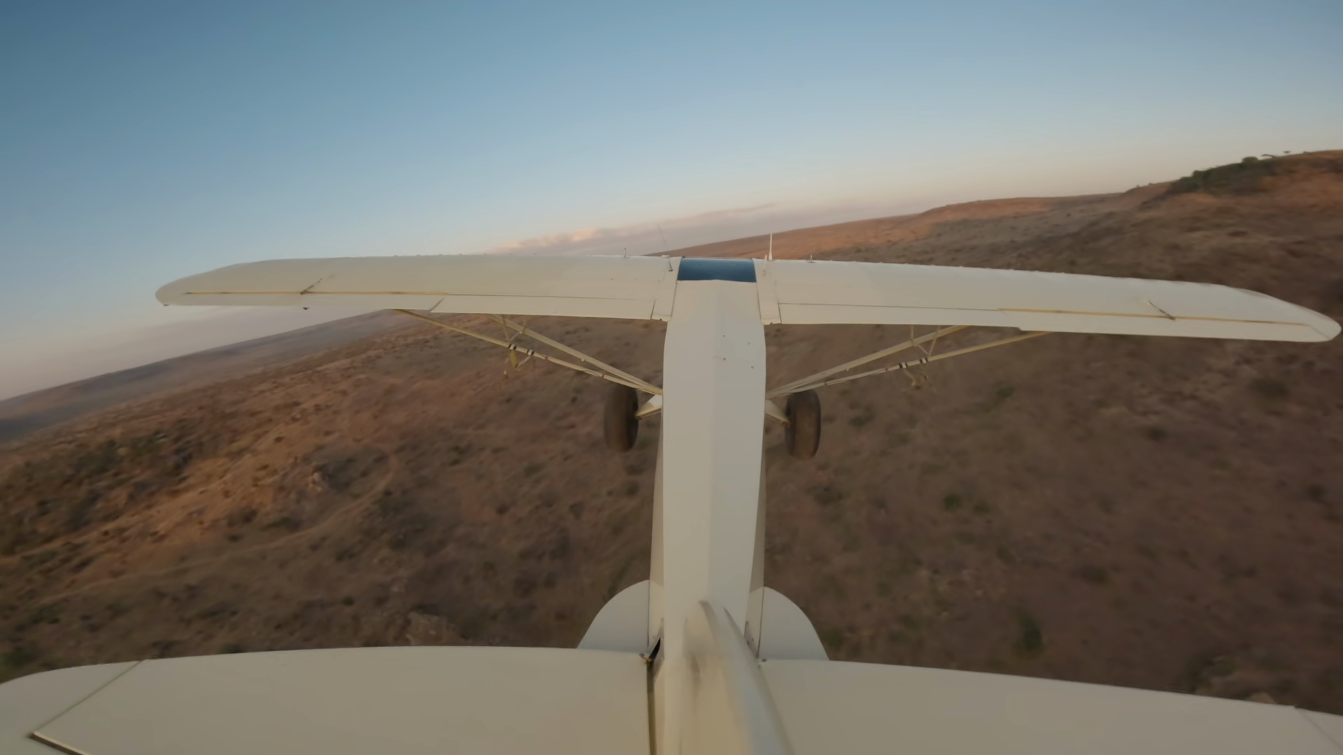 Extreme Wide Tail View Of A Bushcraft Plane Flying Over Dry Plains In Kenya At SunsetÂ