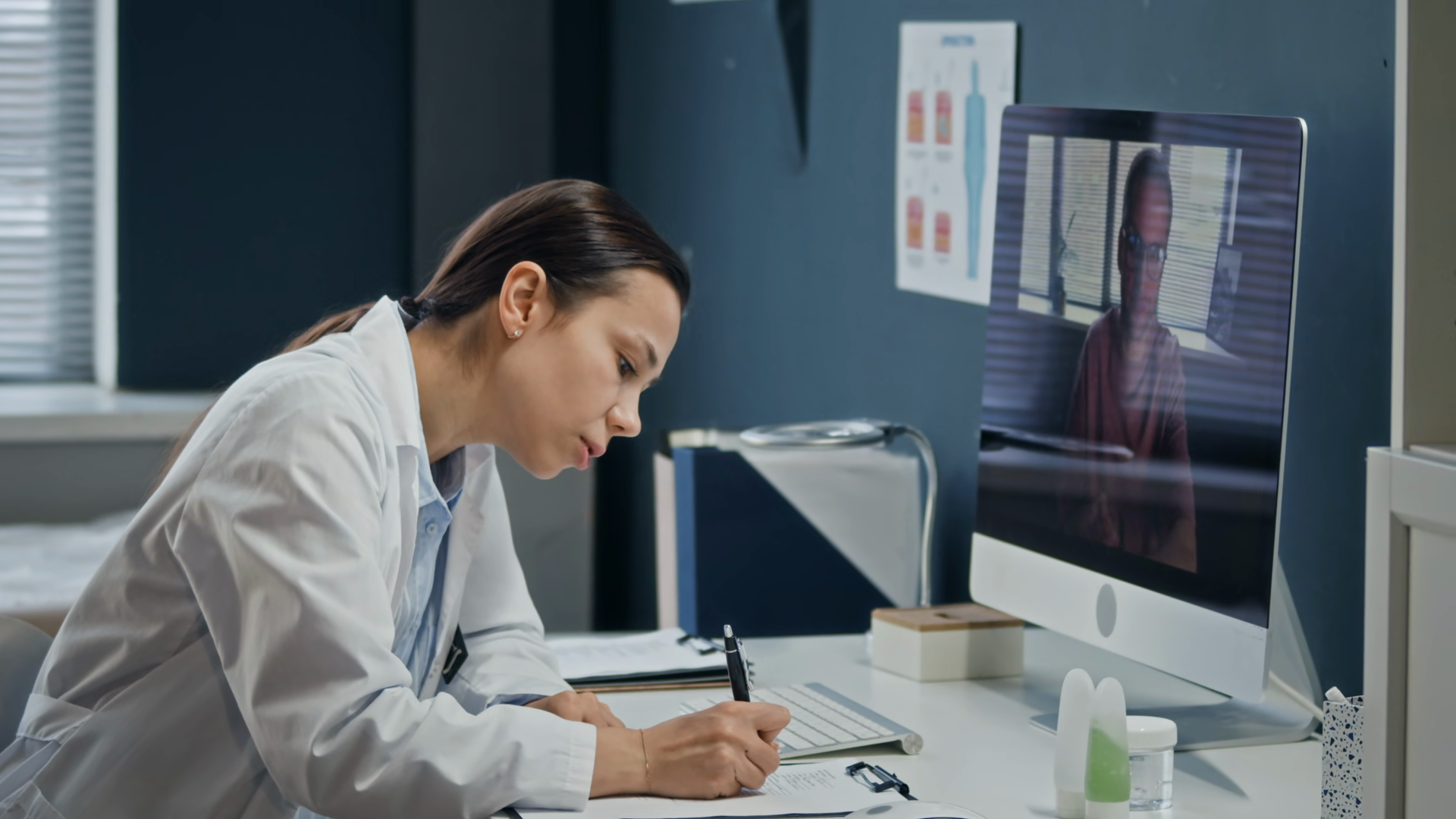Eye Level Side View Waist Up Of Female Dermatologist Providing Remote Skin Consultation Through Video Call On Desktop Computer In Clinical Office SettingÂ
