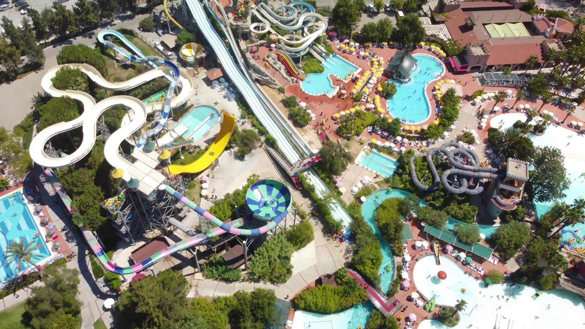 Families Enjoy A Vibrant Day At A Colorful Water Park Captured From Above With Playful Icons Overlaying Pools Slides And Sun Loungers Perfect For Summerthemed Visuals And Leisure Lifestyle ContentÂ