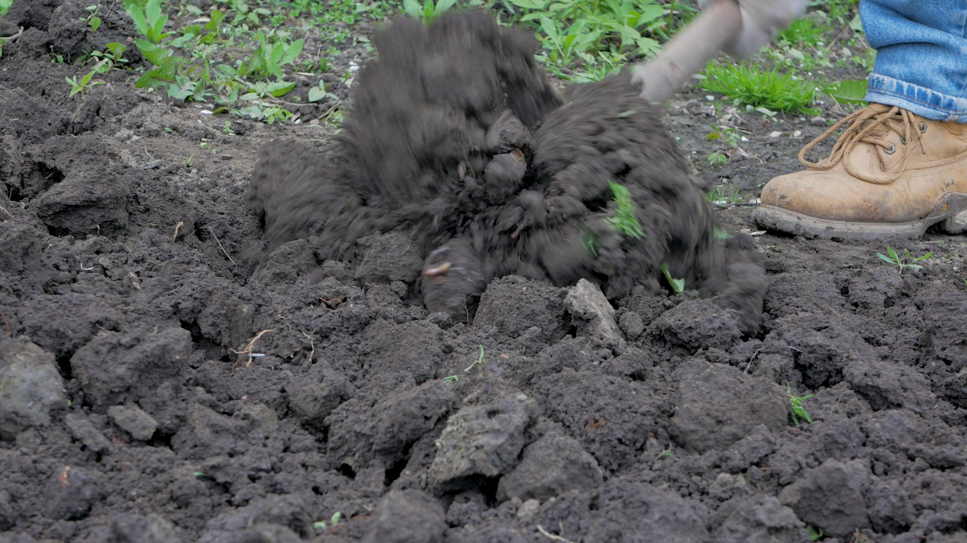 Farmer Prepares Soil With Pitchfork Breaking Up Clumps While Digging In Backyard Garden Close UpÂ