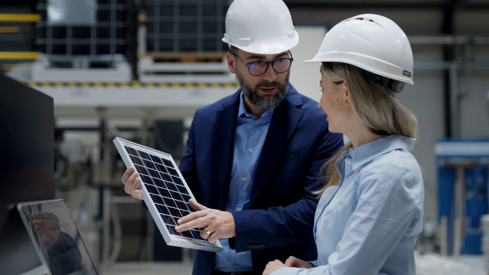 Female Engineer And Male Director Talking In Modern Industrial Factory About Solar Panel InstallationÂ