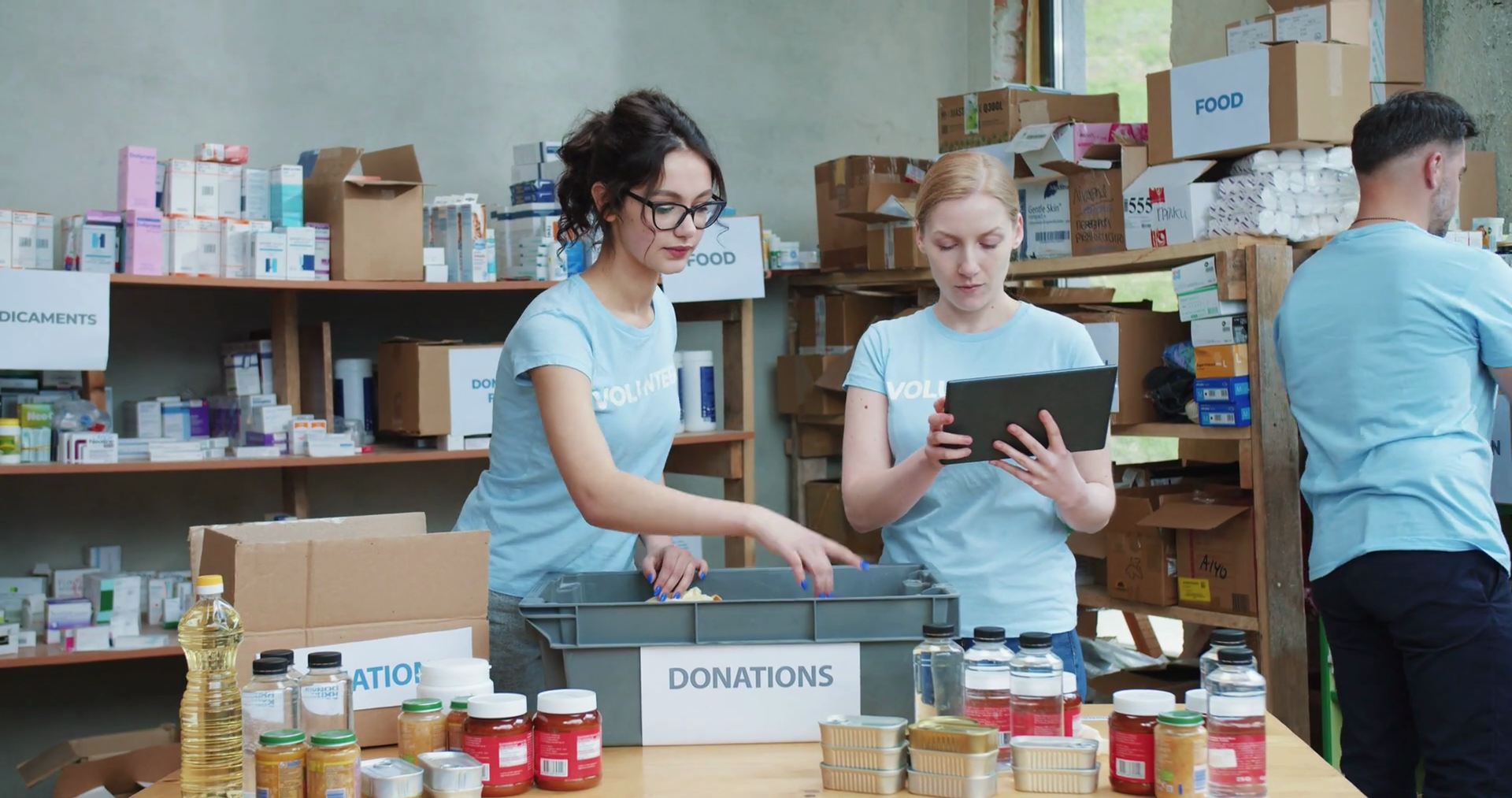 Female Food Bank Worker Typing On Digital Tablet While Her Colleague Packing Donation Boxes At Warehouse Â