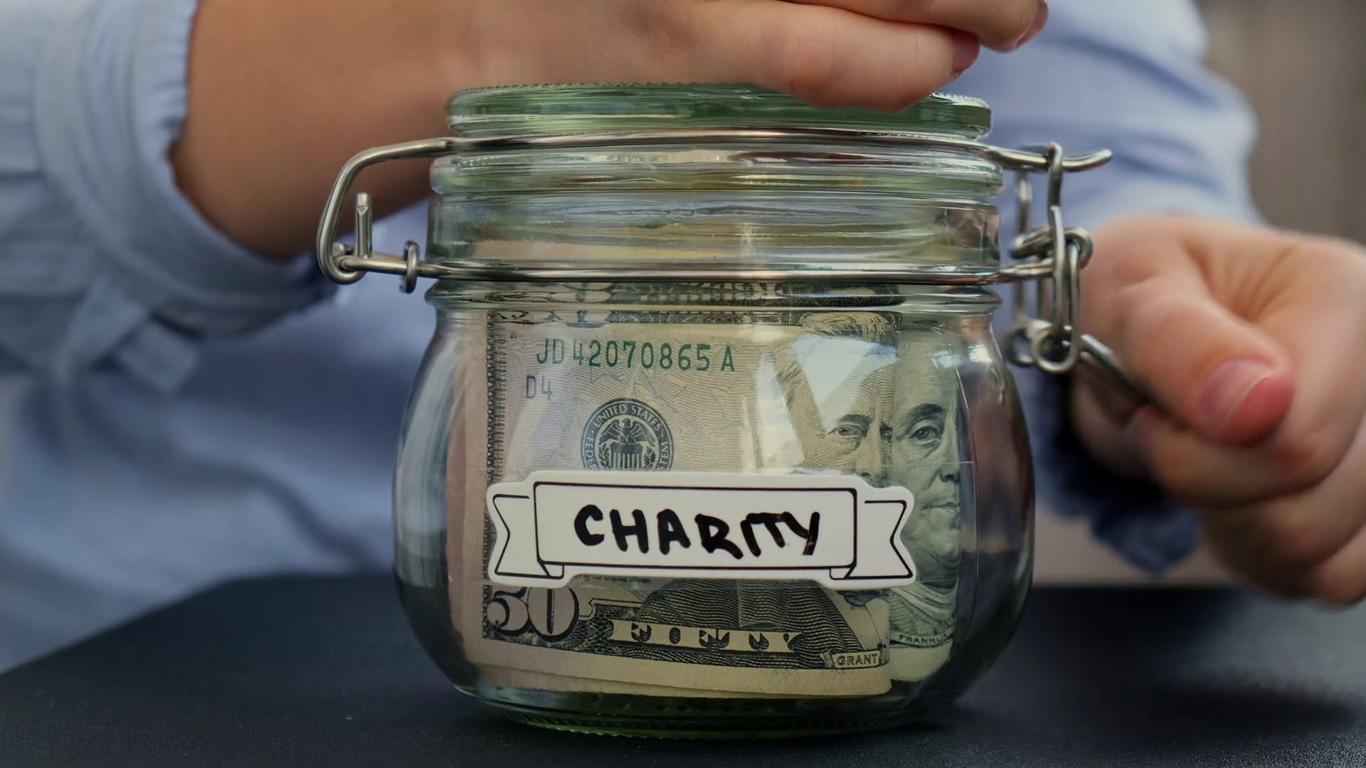 Female Hands Add Money To Saving Money In Jar Filled With Dollars Banknotes Charity Transcription In Front Of Jar Managing PersonalÂ