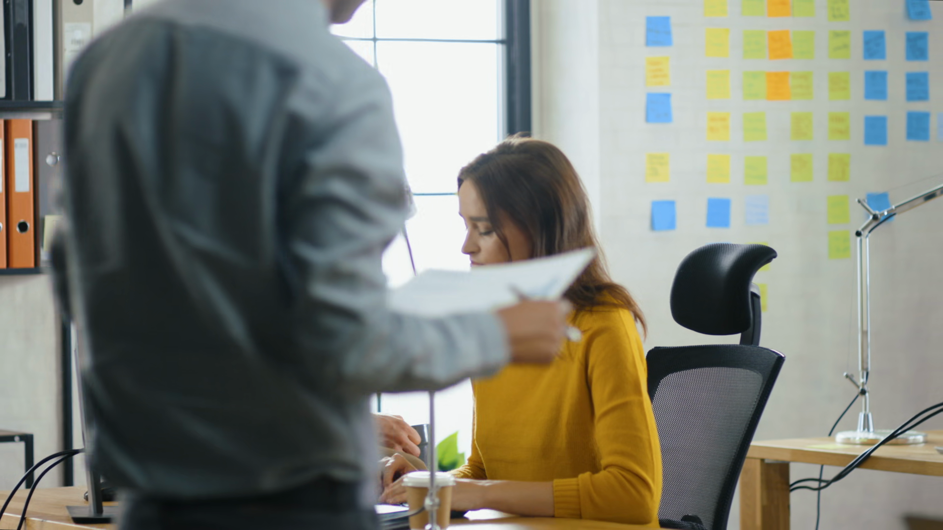 Female Specialist Works On Desktop Computer Casual Friendly Project Manager Sits On The Table Beside And Gives Advice On Optimizing Customer Experience Management Modern Office With Diverse TeamÂ