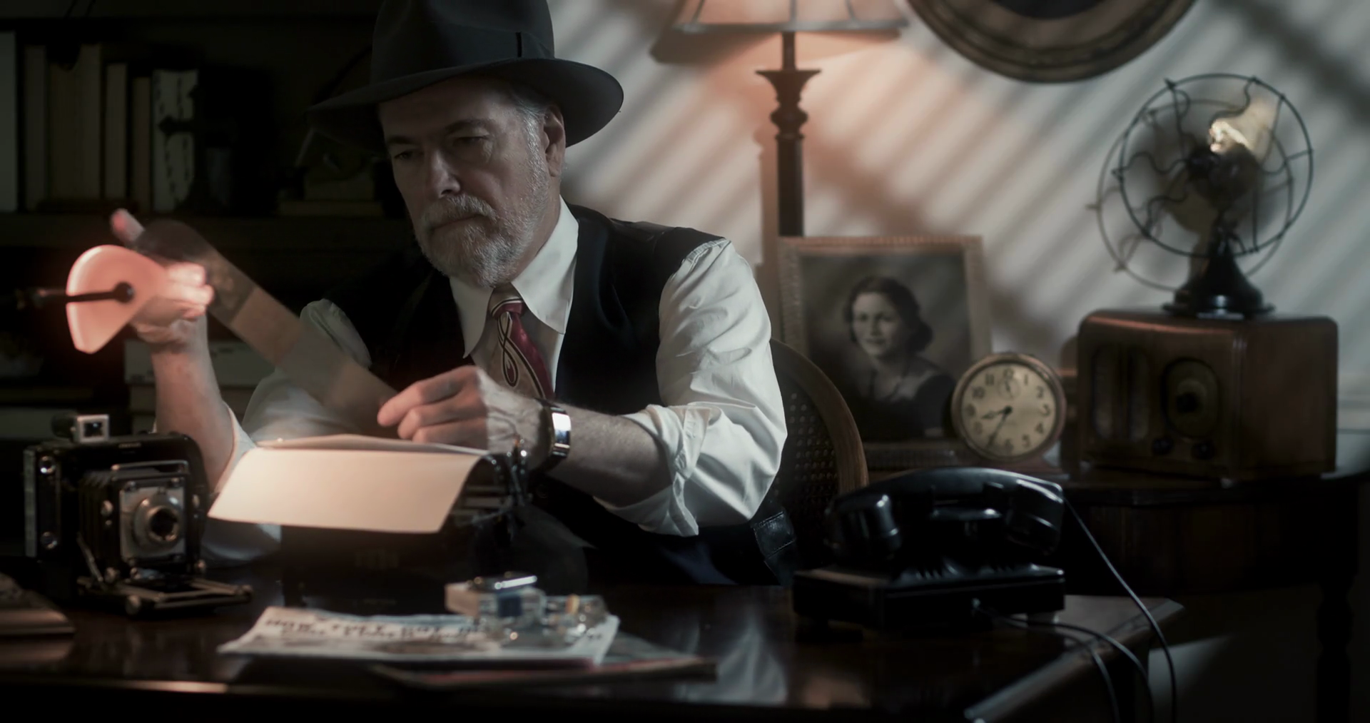 Film Noir Detective Looking At Photos On A Negative RollÂ