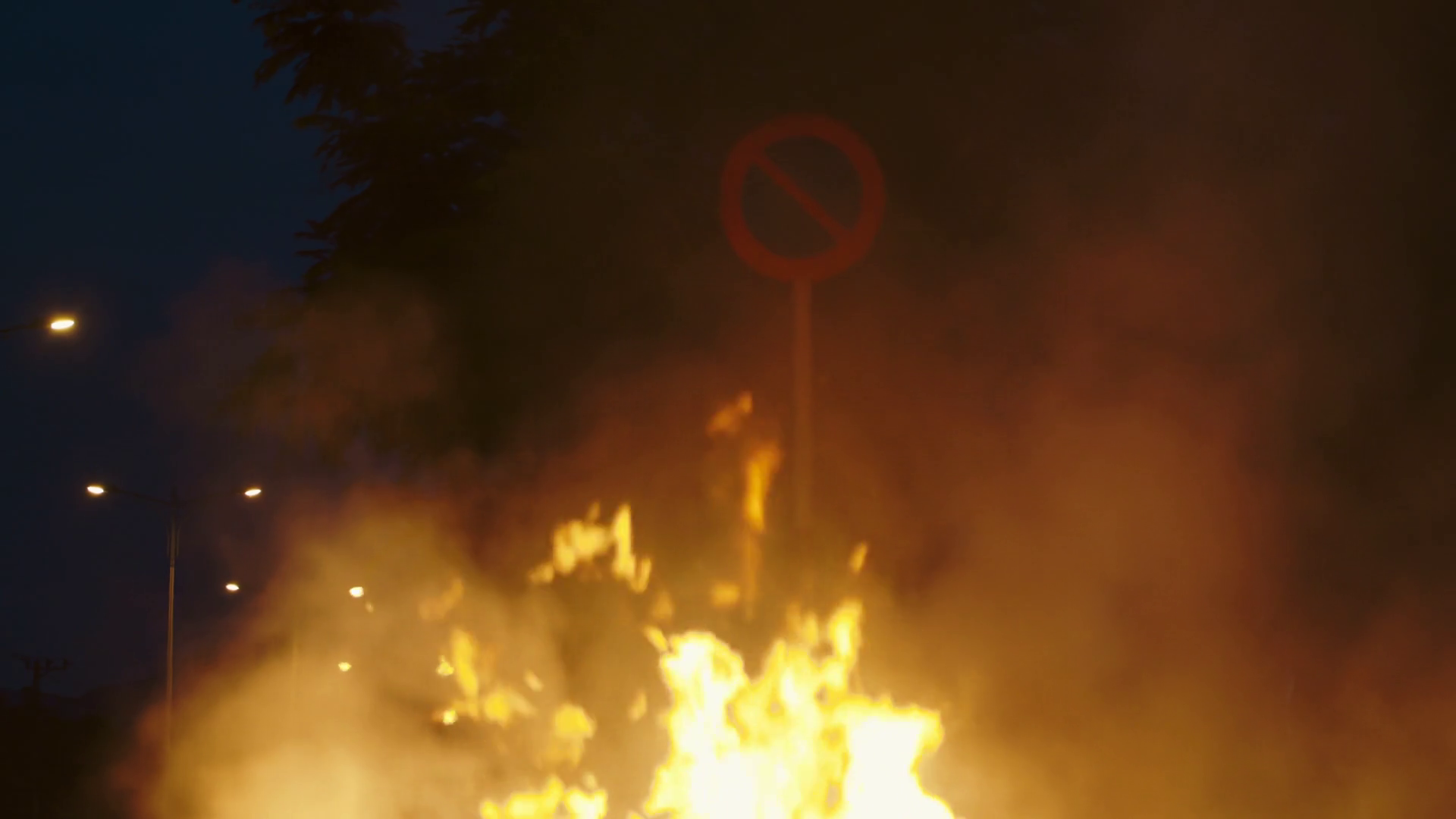 Fire Burns On Deadly Car Collision Place Near Road Sign At NightÂ