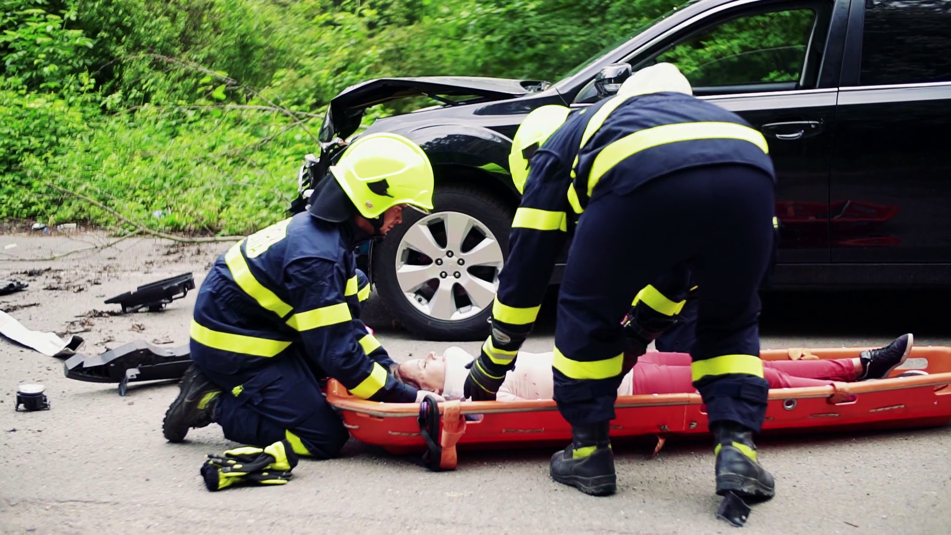 Rescue Team Assisting Injured Woman After Car AccidentÂ