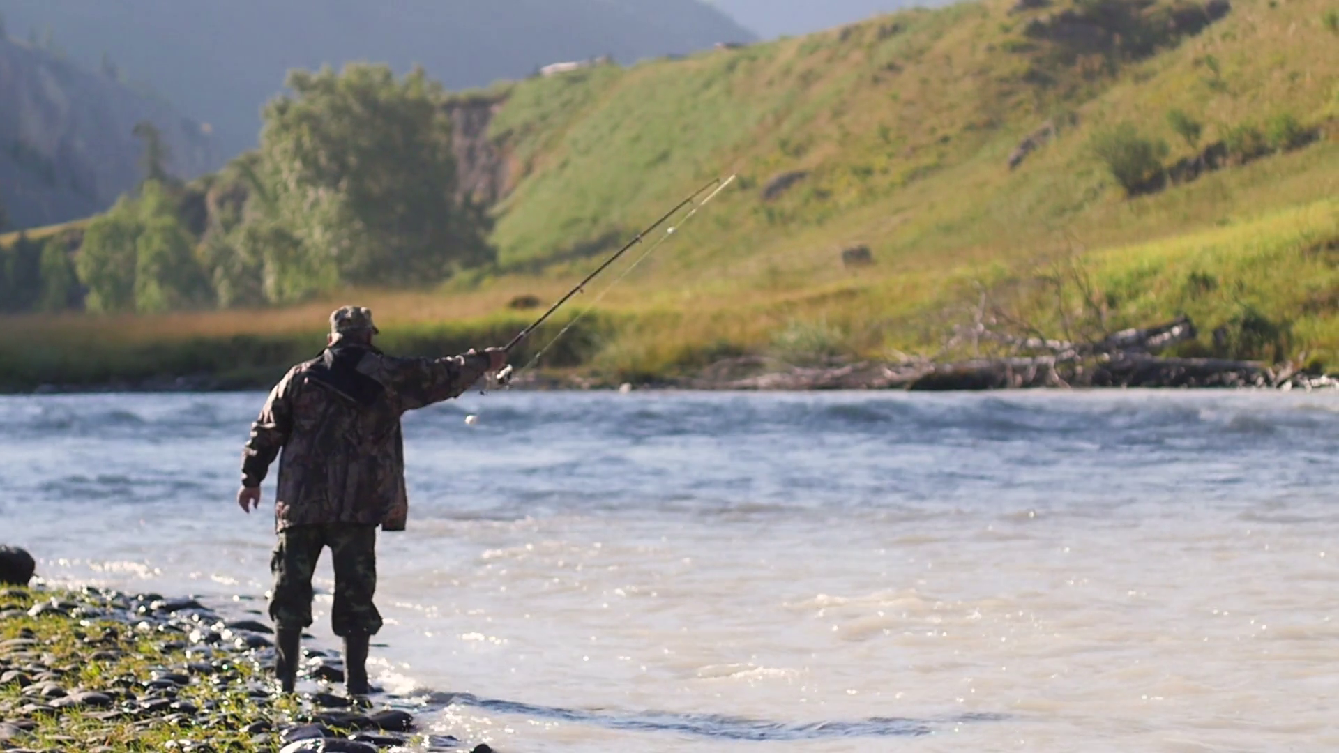 Fisherman Catches Fish Against The Backdrop Of A Mountain Landscape Fisherman Tourist Roars In A Mountain River Hobby Men Fisherman Adult Man Fishing Early In The MorningÂ