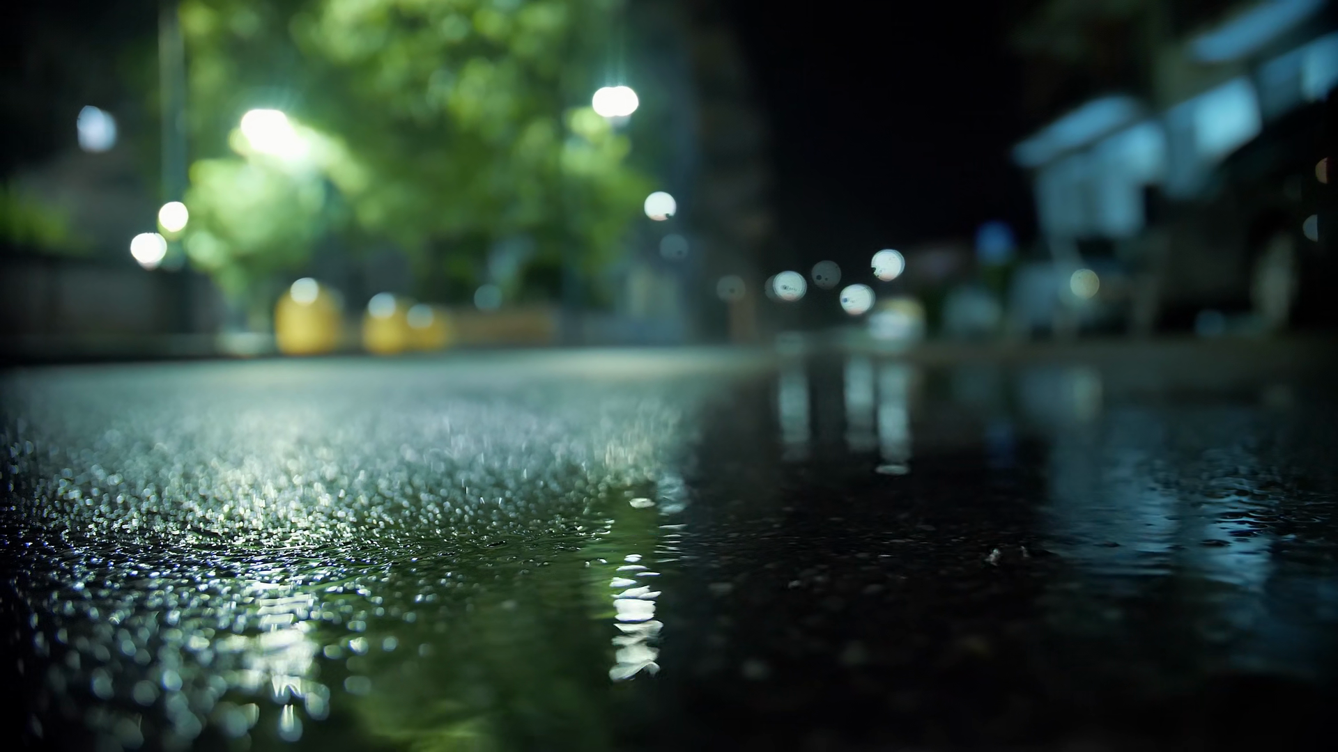 Flooded City Road At Night Under Heavy Rainfall With Bright Lights Reflecting In The Rising WaterÂ