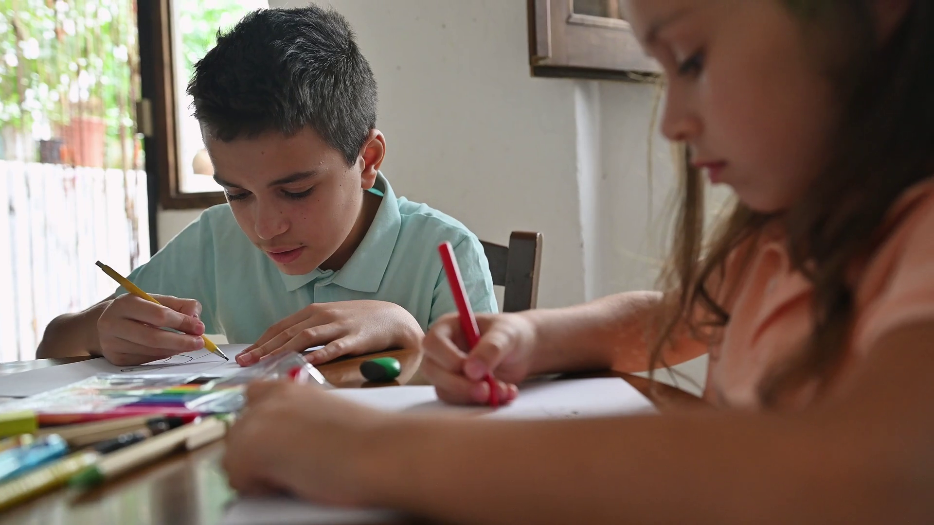 Focused Children Engaged In Drawing And Writing Activities At Home During A Creative Educational SessionÂ