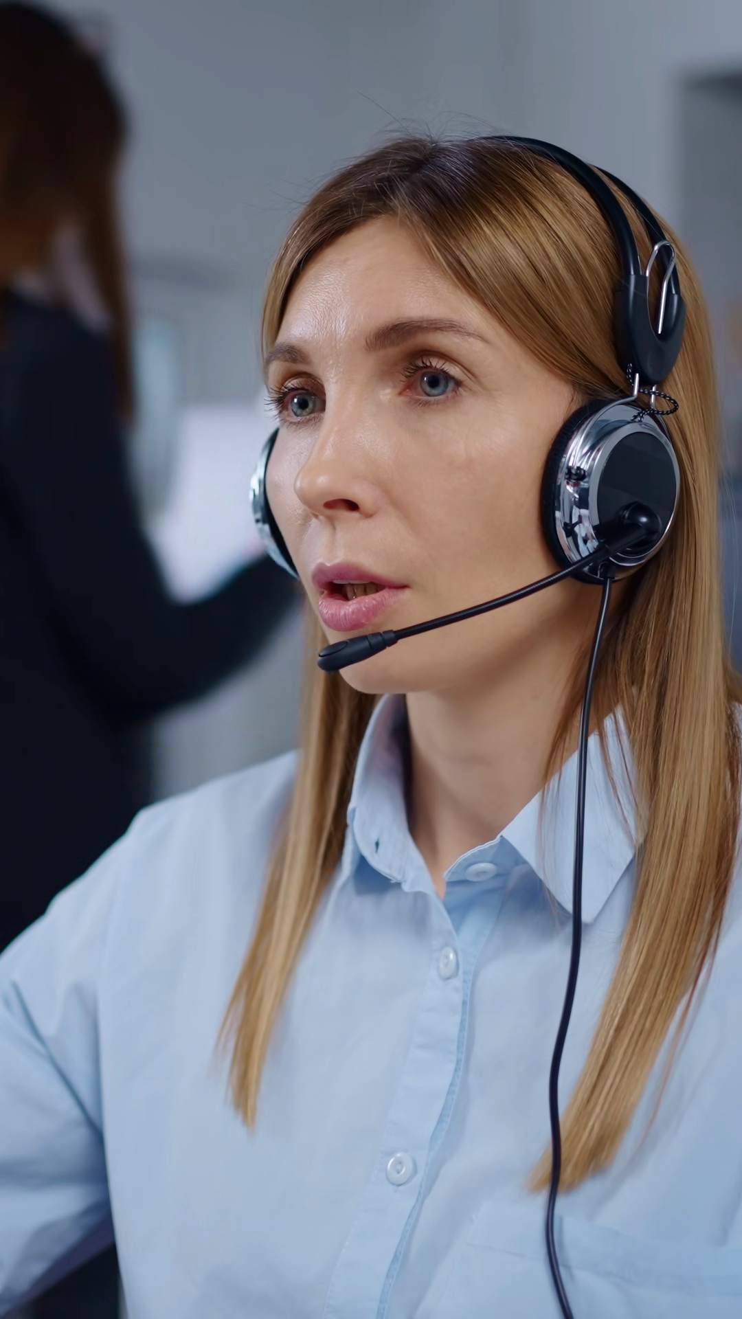 Focused Female Customer Support Representative Wearing Headset And Working On Desktop Computer In Modern Office Assisting Clients WithÂ