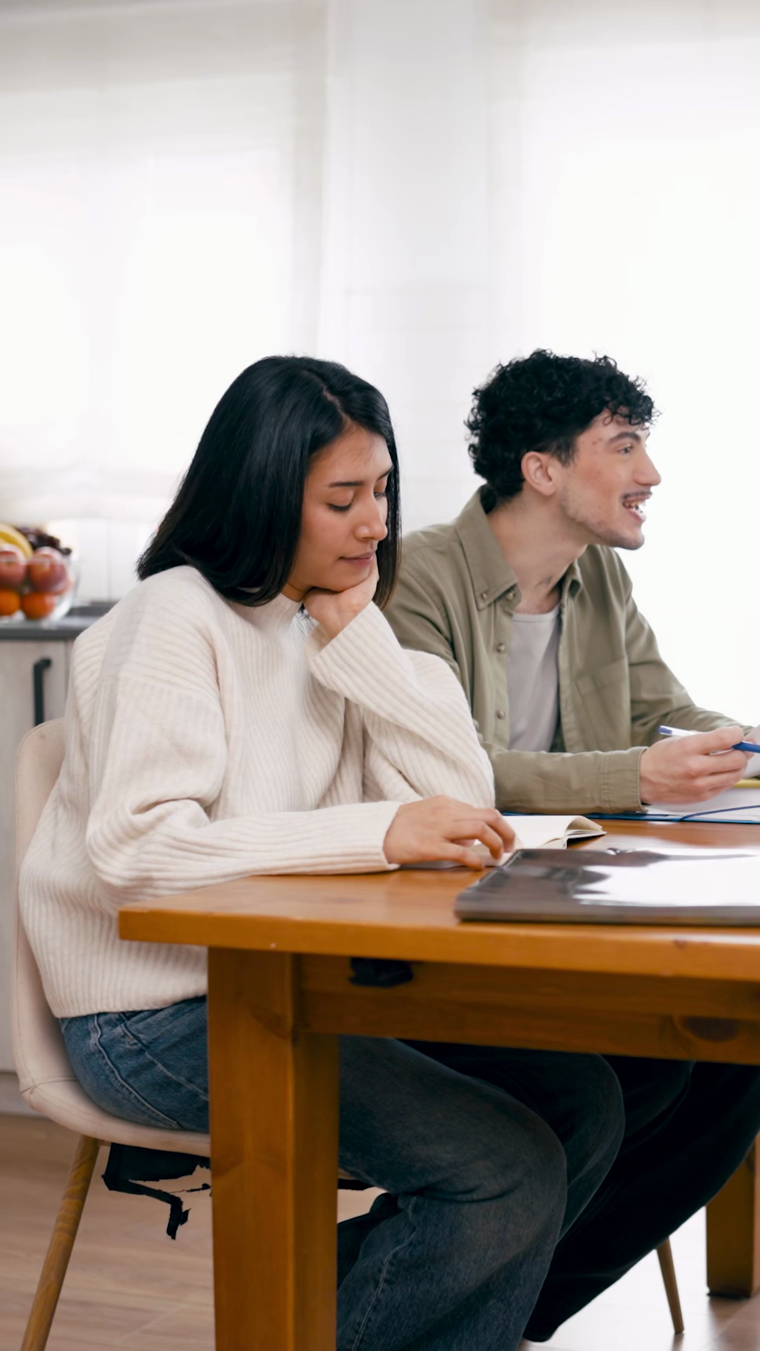 Focused Young Multicultural Sitting At A Wooden Table Managing Finances And Calculating Expenses Together In Their Modern ApartmentÂ
