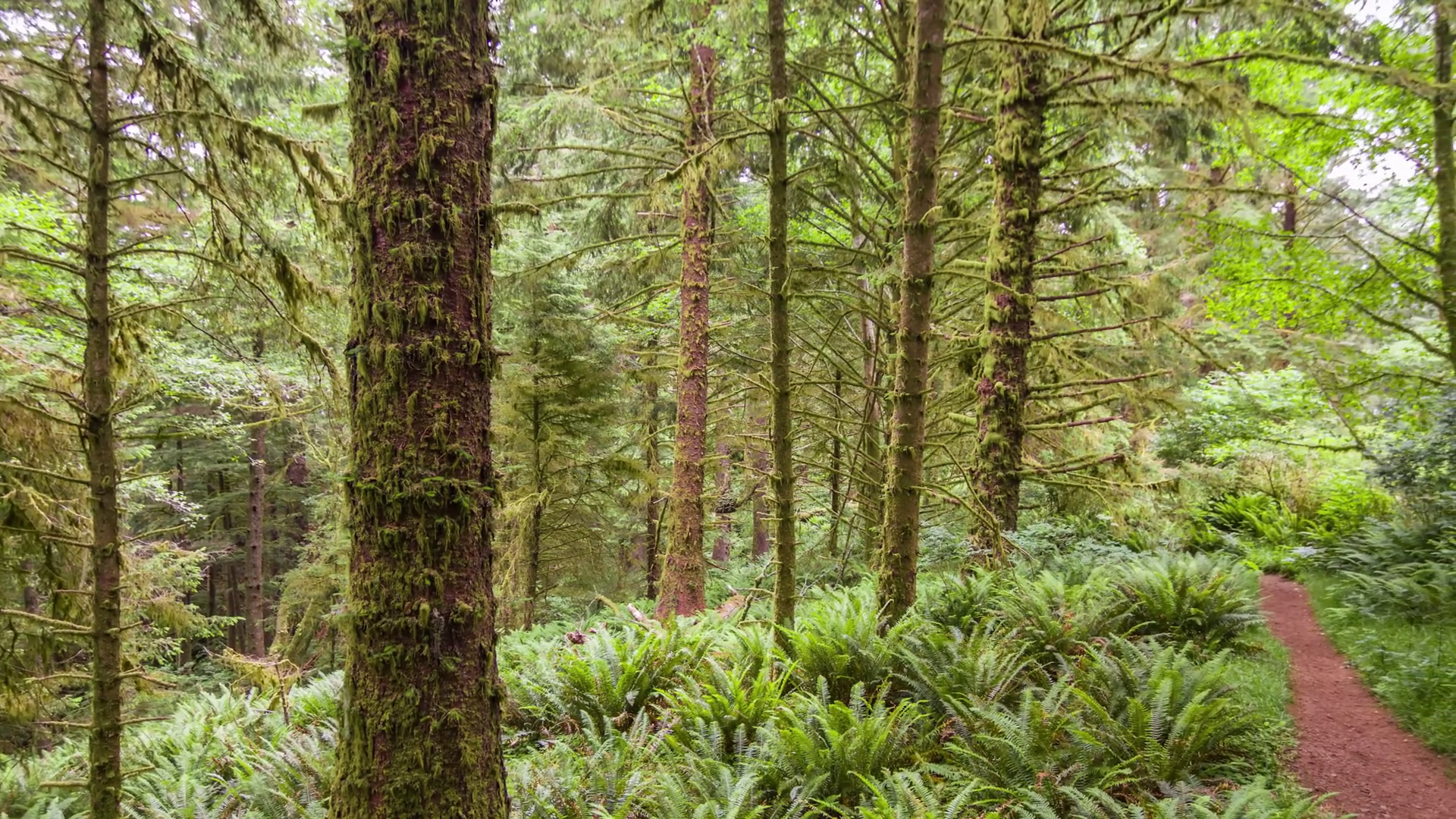 Footage Of Lush Forest With Towering Trees And Thick Ferns Covering The Ground Typical Of The Pacific Northwests Diverse EcosystemsÂ
