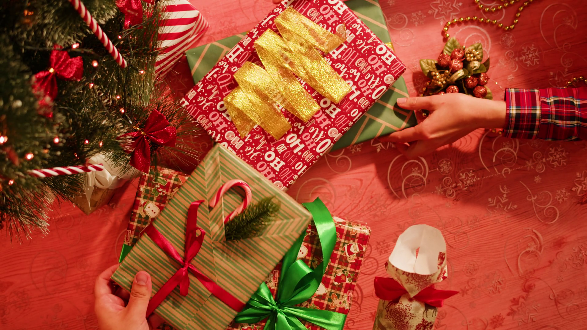Friends Giving Presents To Each Other Top View Celebrating New Year Sitting At Dining Table International Young People Making SurprisesÂ