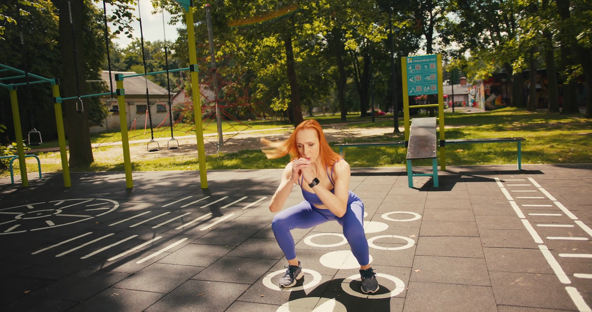 Full Shot Of Confident Middle Aged Fit Woman In Violet Athletic Sportswear Exercising At Outdoor Gym Performing SquatsÂ