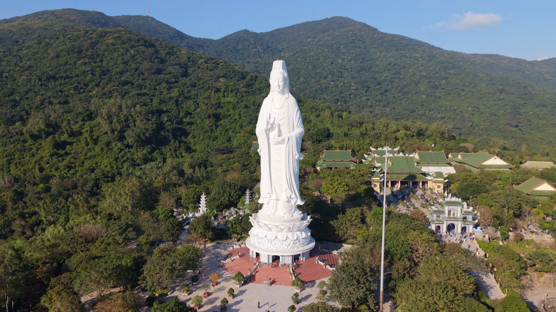Giant White Statue Overlooking Forested Hills And Lotus Pedestal Aerial View Of Temple Complex At Son Tra Da Nang Vietnam With VisitorsÂ