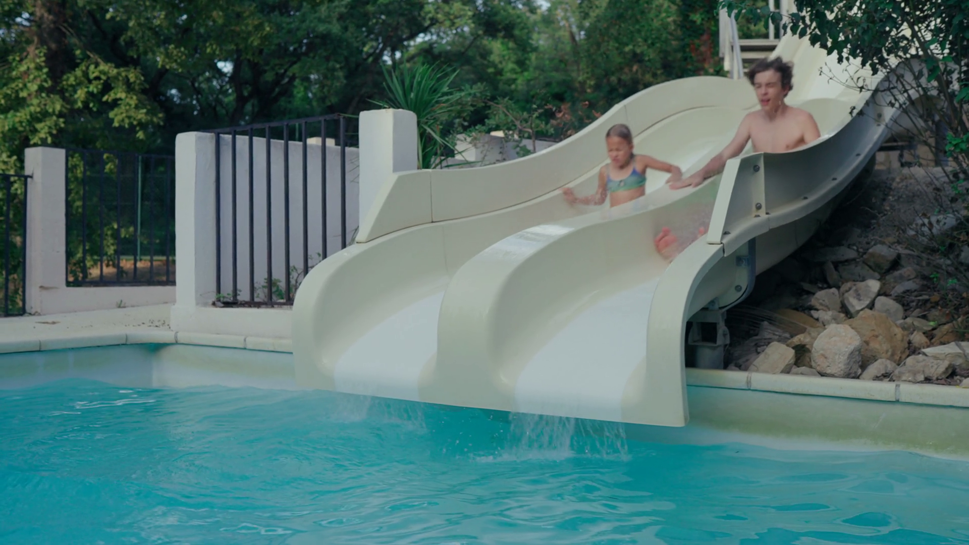 Girl And Teenager Splash Into A Swimming Pool From Water Slides In A Backyard Setting With Green Trees AroundÂ