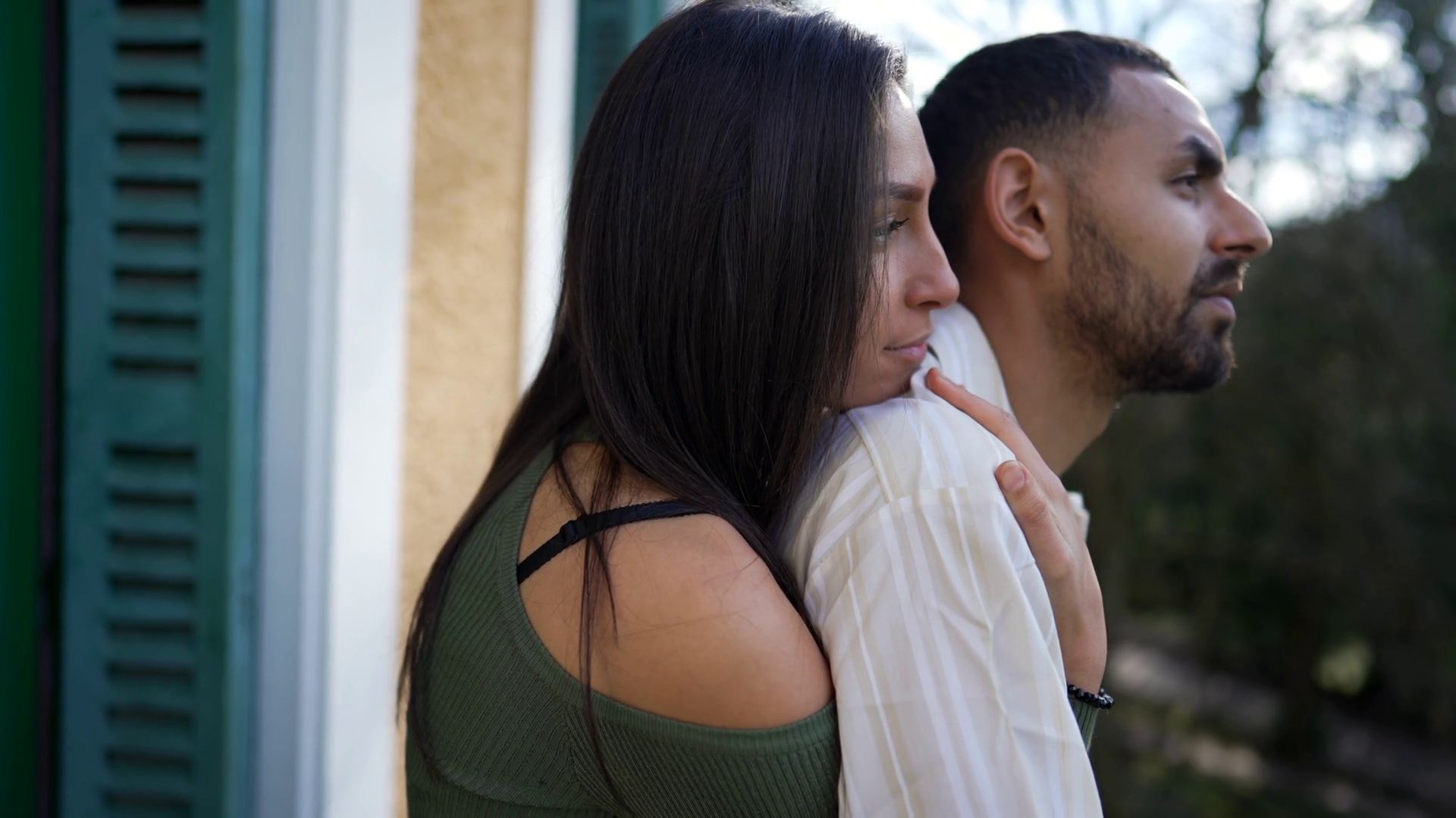 Girlfriend Embracing Boyfriend From Behind While Standing Outside At Home Balcony A Loving Middle Eastern Couple Showing Love And Support While Contemplating NatureÂ