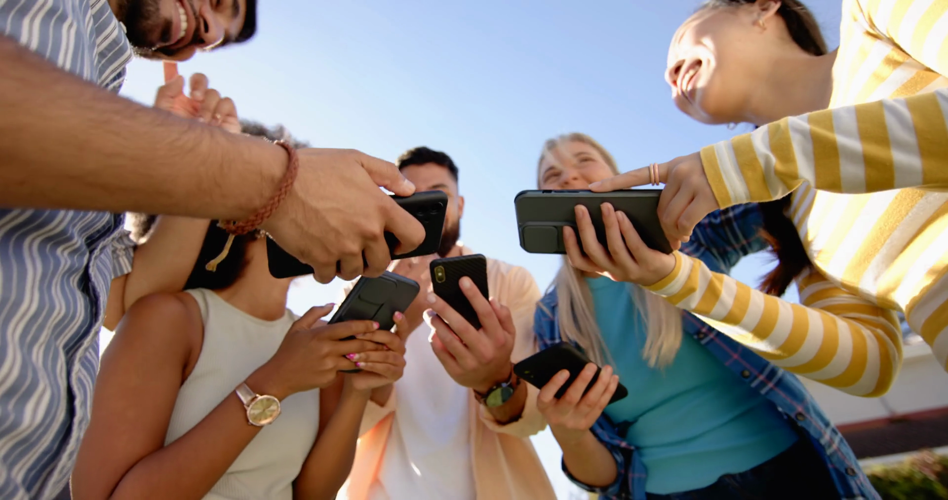 Group Of Young Friends Using Smartphones Outdoors Enjoying Social Media TogetherÂ