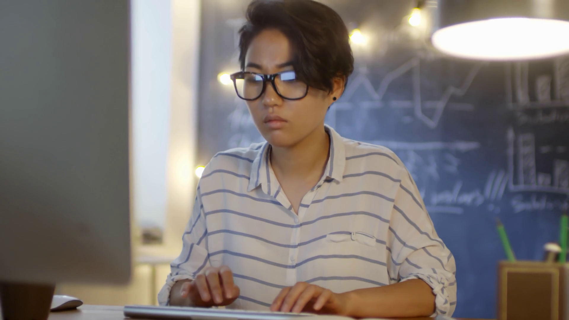 Handheld Medium Shot Of Focused Asian Businesswoman In Glasses Working On Desktop Computer In Modern Office Late In The EveningÂ
