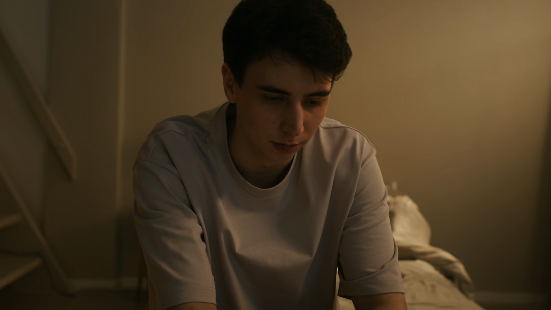 Handheld Medium Shot Of Gen Z Caucasian Man Sitting At Desk Holding Old Photograph And Reminiscing About Past In Sleepless Episode In Dimly Lit BedroomÂ