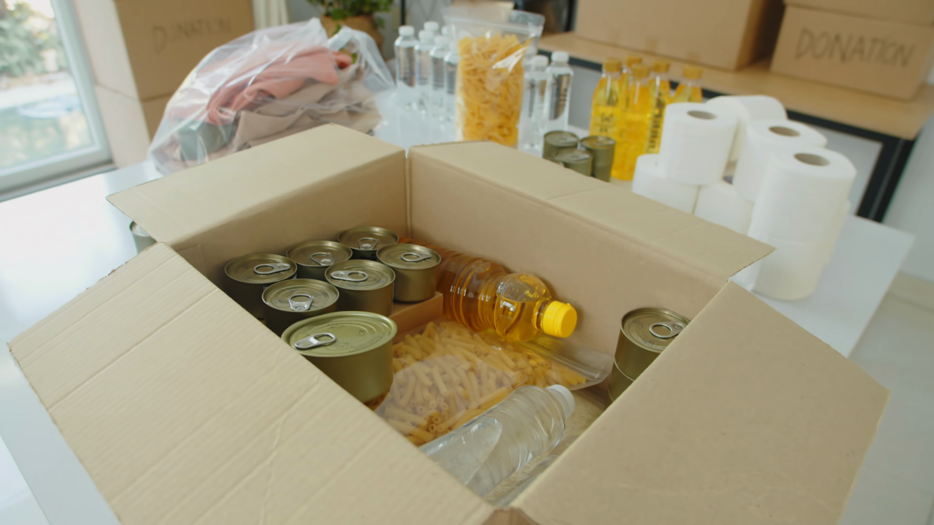 Handheld Shot Of Canned Goods Cooking Oil Macaroni And Other Food In Donation Box On Table In Volunteer CenterÂ