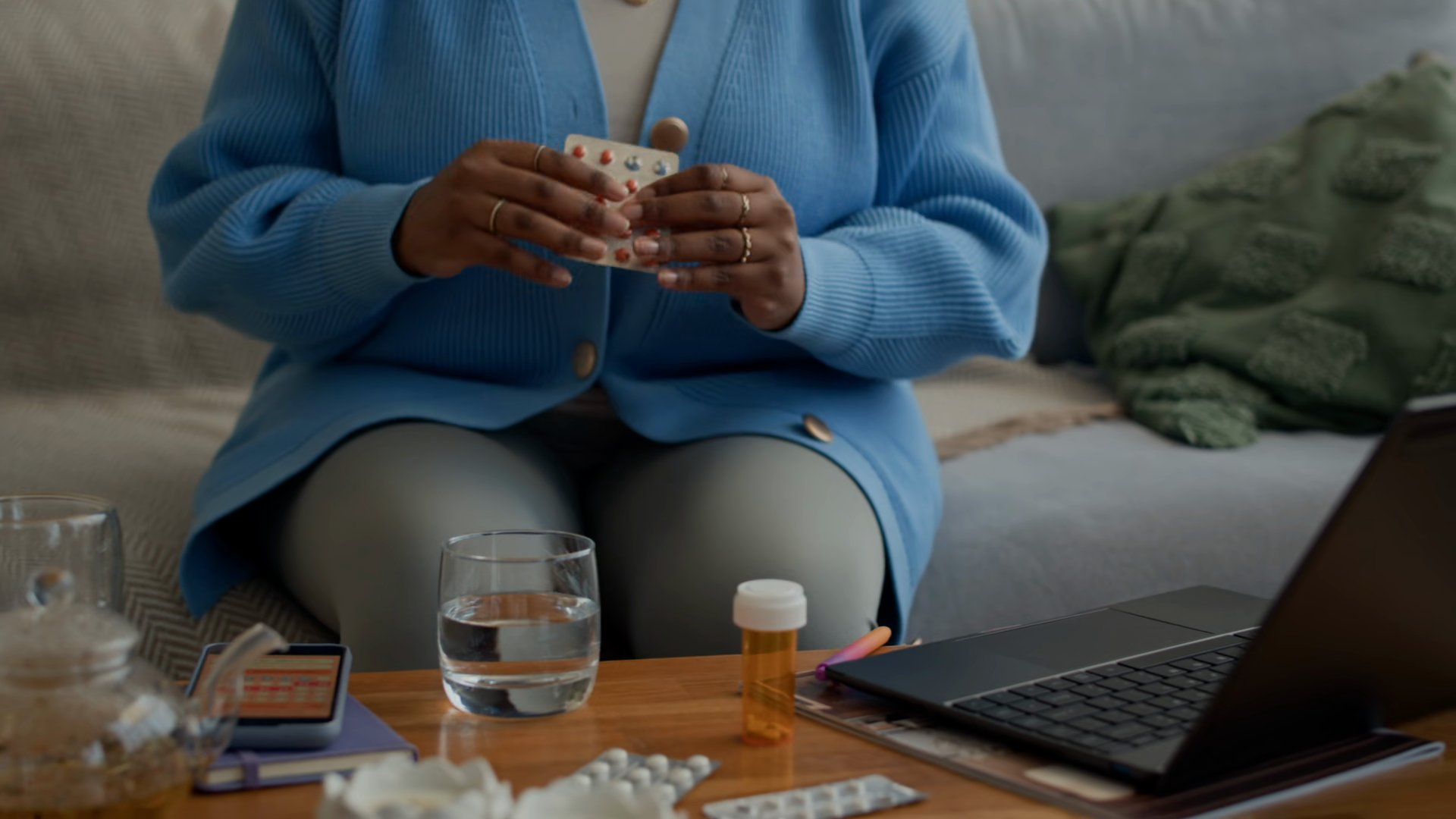 Handheld Shot Of Young Adult Black Woman Consulting About Contraceptive Pills During Video Call On Wireless Laptop While Sitting On Couch In Living RoomÂ