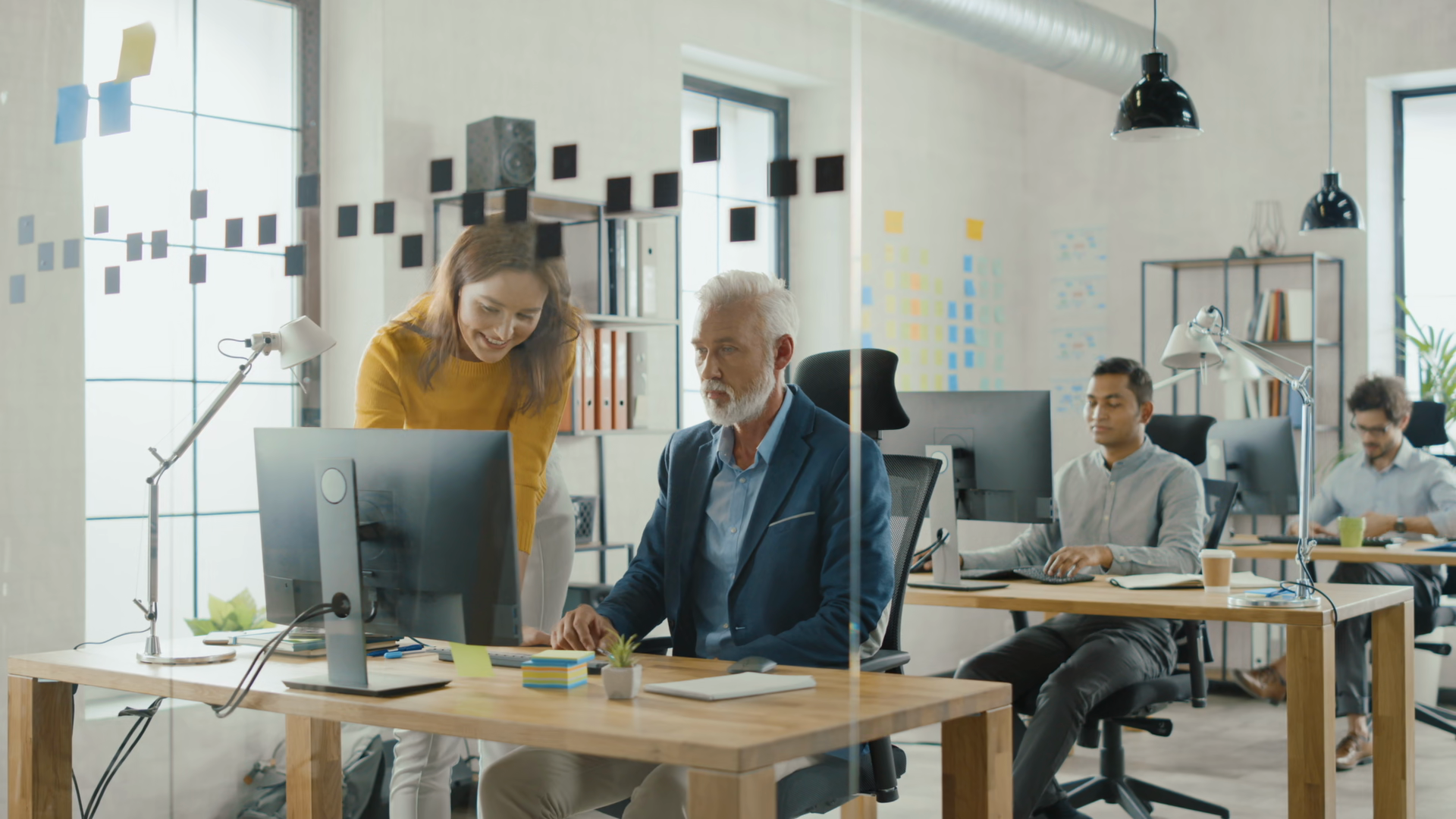 Handsome Middle Aged Creative Engineer Sitting At The Desk Working On Desktop Computer Has Discussion With Beautiful Female Project Manager Office With Friendly Colleagues Chatting Finding SolutionsÂ