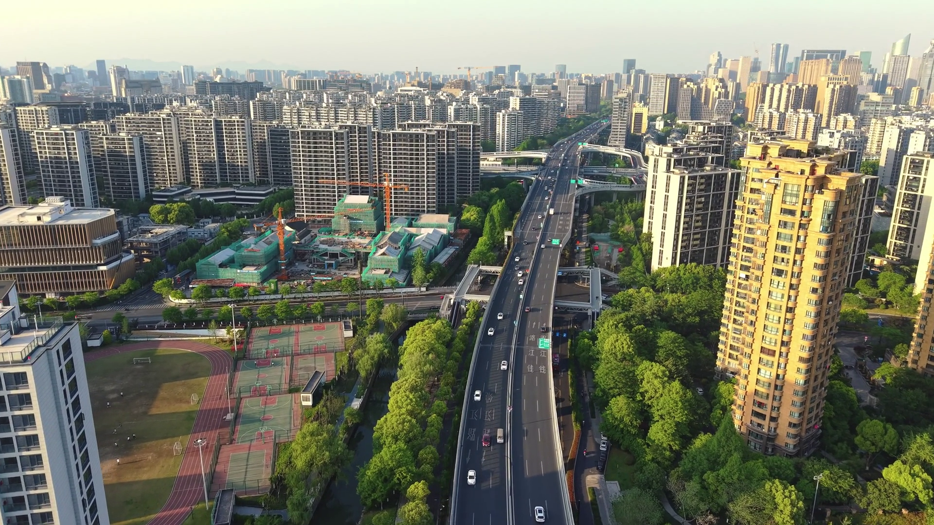 Hangzhou China April 18 2025 Aerial Views Capture A Vibrant City Skyline With Towering Buildings And A Busy HighwayÂ