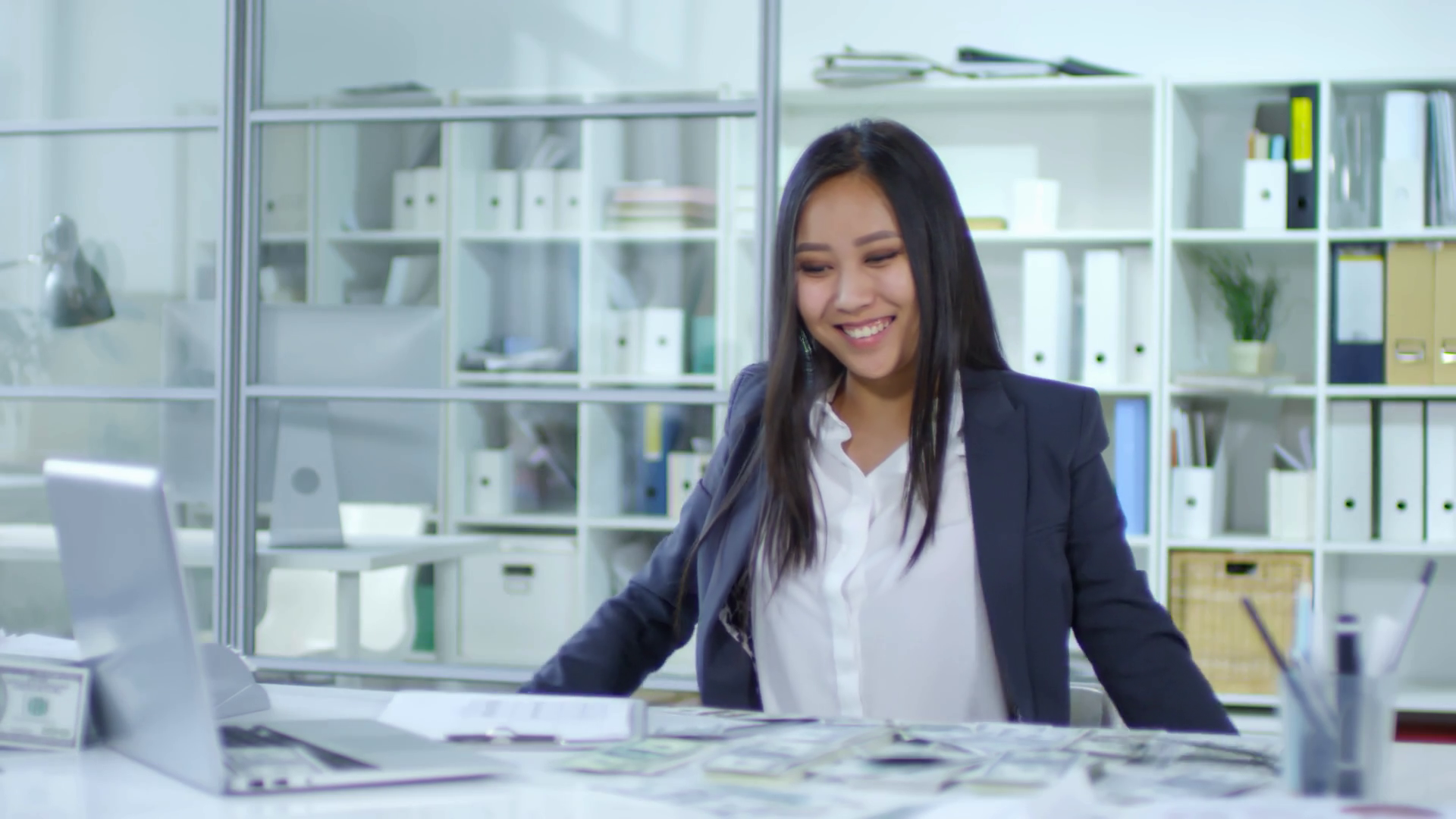 Happy Asian Businesswoman Throwing Money Up In The Air And Smiling As Banknotes Falling Down In The OfficeÂ