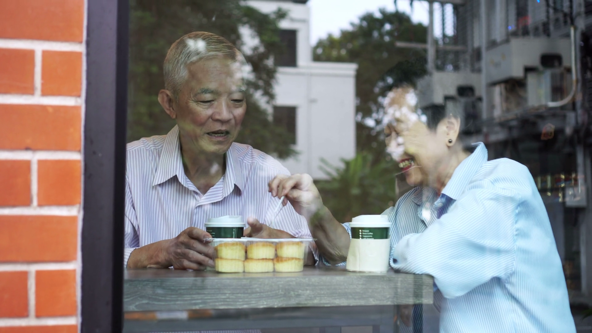 Happy Asian Elderly Senior Couple Drinking Morning Coffee Through Cafe Glass FrontÂ
