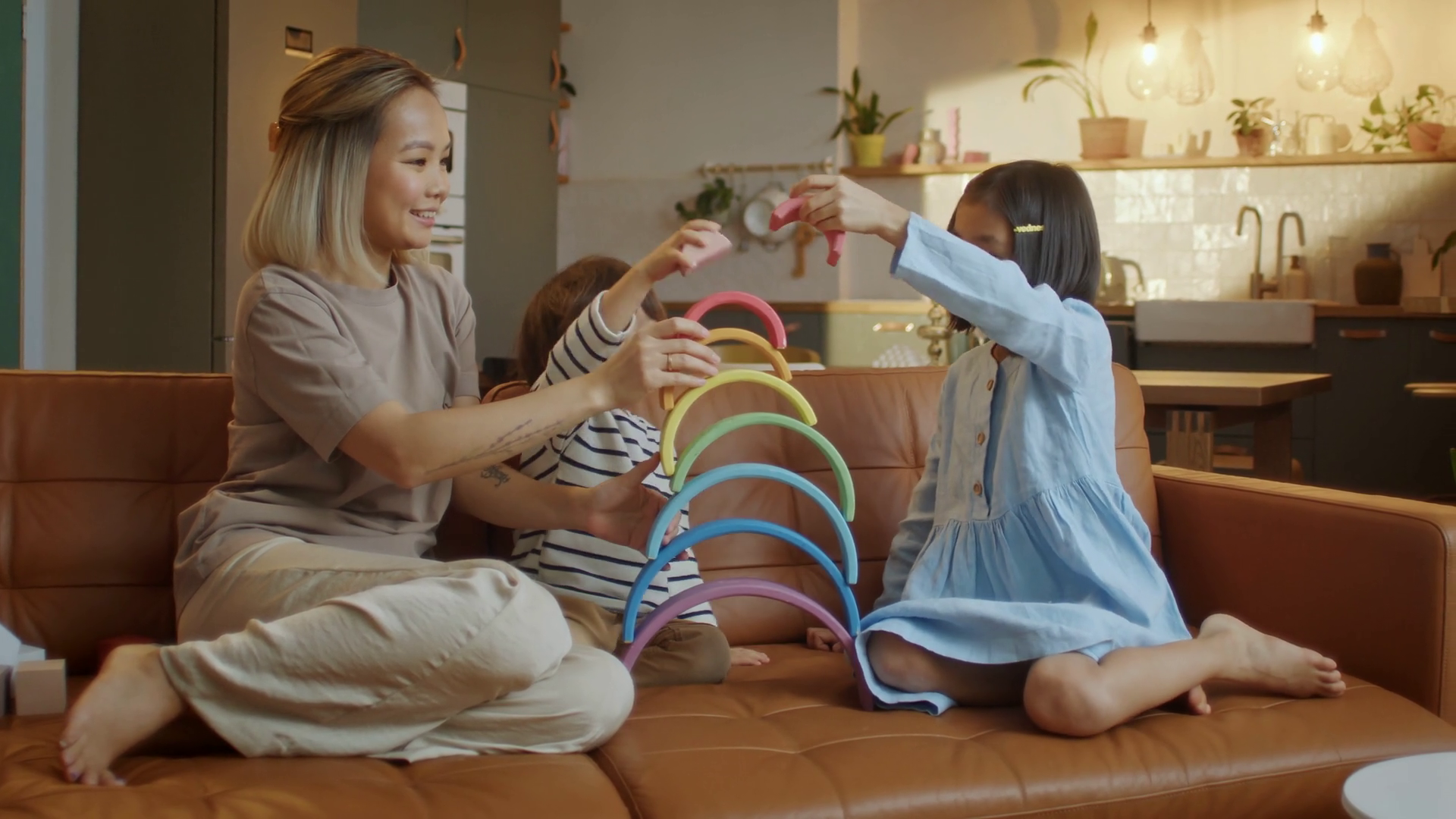 Happy Young Mother And Two Children Playing Together Nanny Engaging Kids With Board Game And Rainbow Wooden ToysÂ
