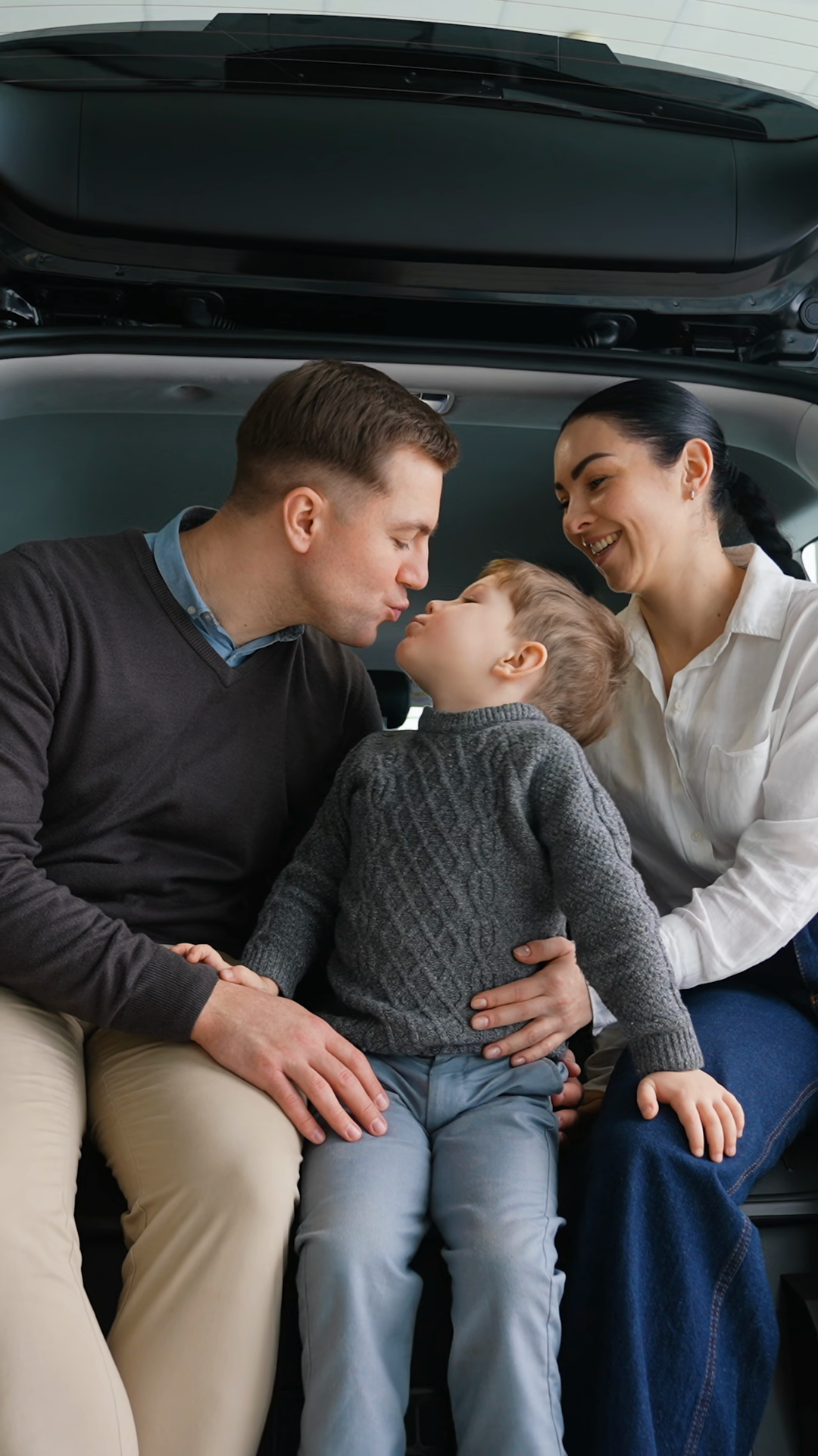 Happy Family Sitting In Their New Car Trunk At DealershipÂ