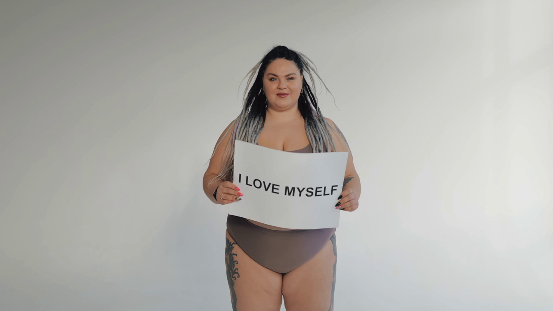 Happy Fat Woman In Underwear With Drearlocks Holding Body Positive Poster I Love Myself Stout Girl In Sweamwer Isolated Smiling To Camera Diverse Beauty Diversity Tolerance ConceptÂ