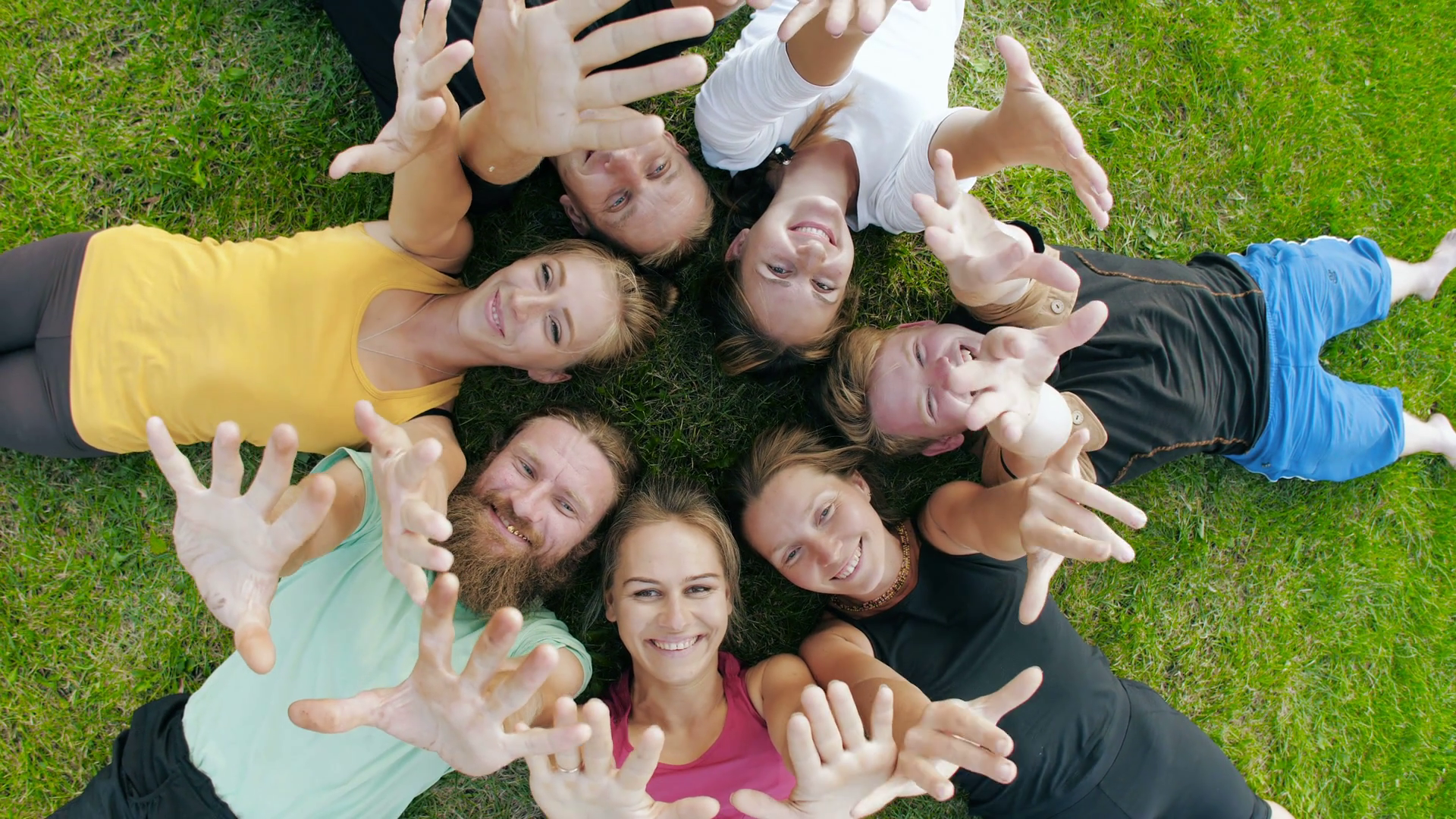 Happy Friends Lying On Grass And Waving HandsÂ