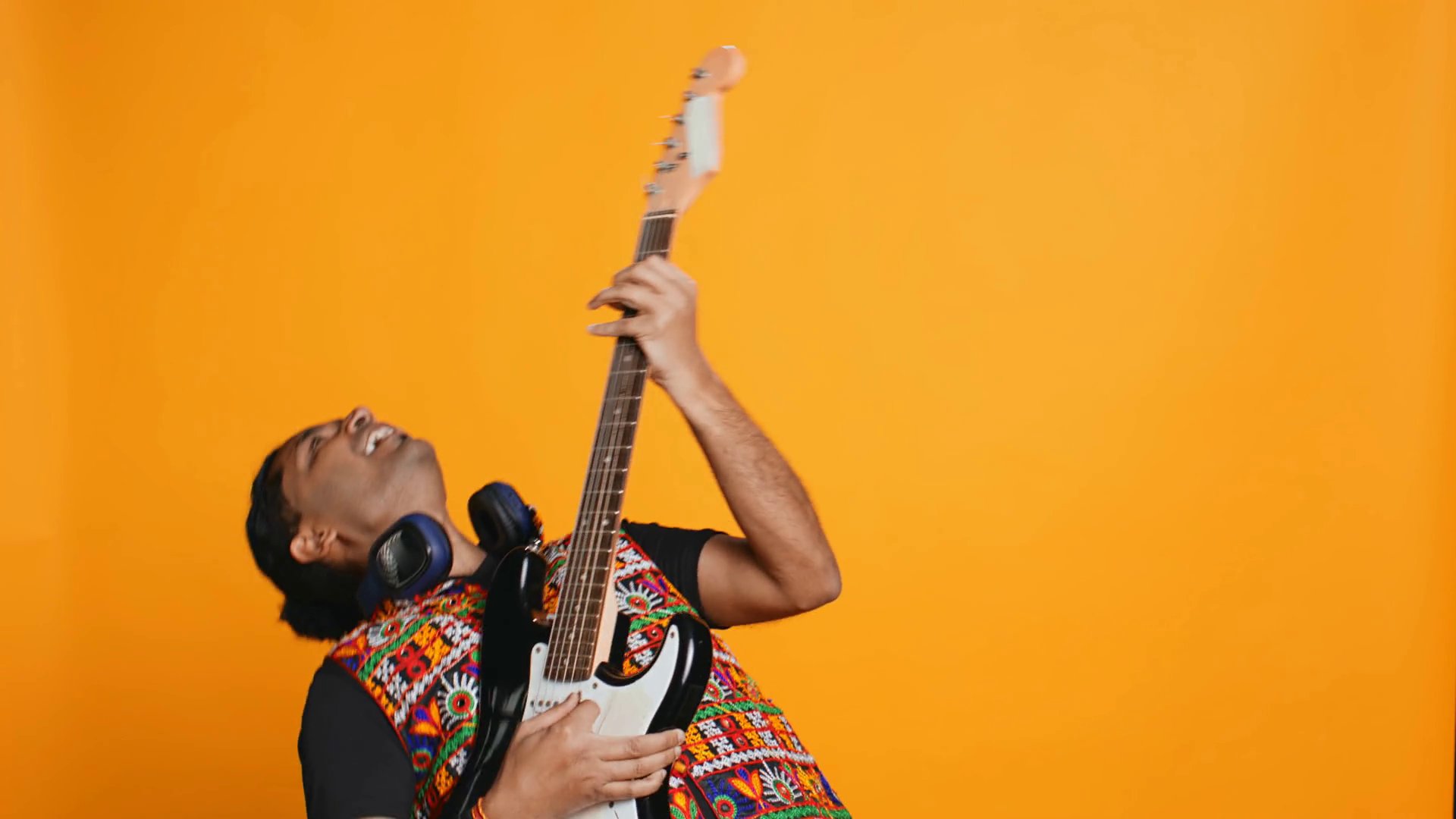 Happy Man Holding Electric Guitar Playing Rock Music Isolated Over Studio Background Cheerful Indian Musician Using Musical InstrumentÂ